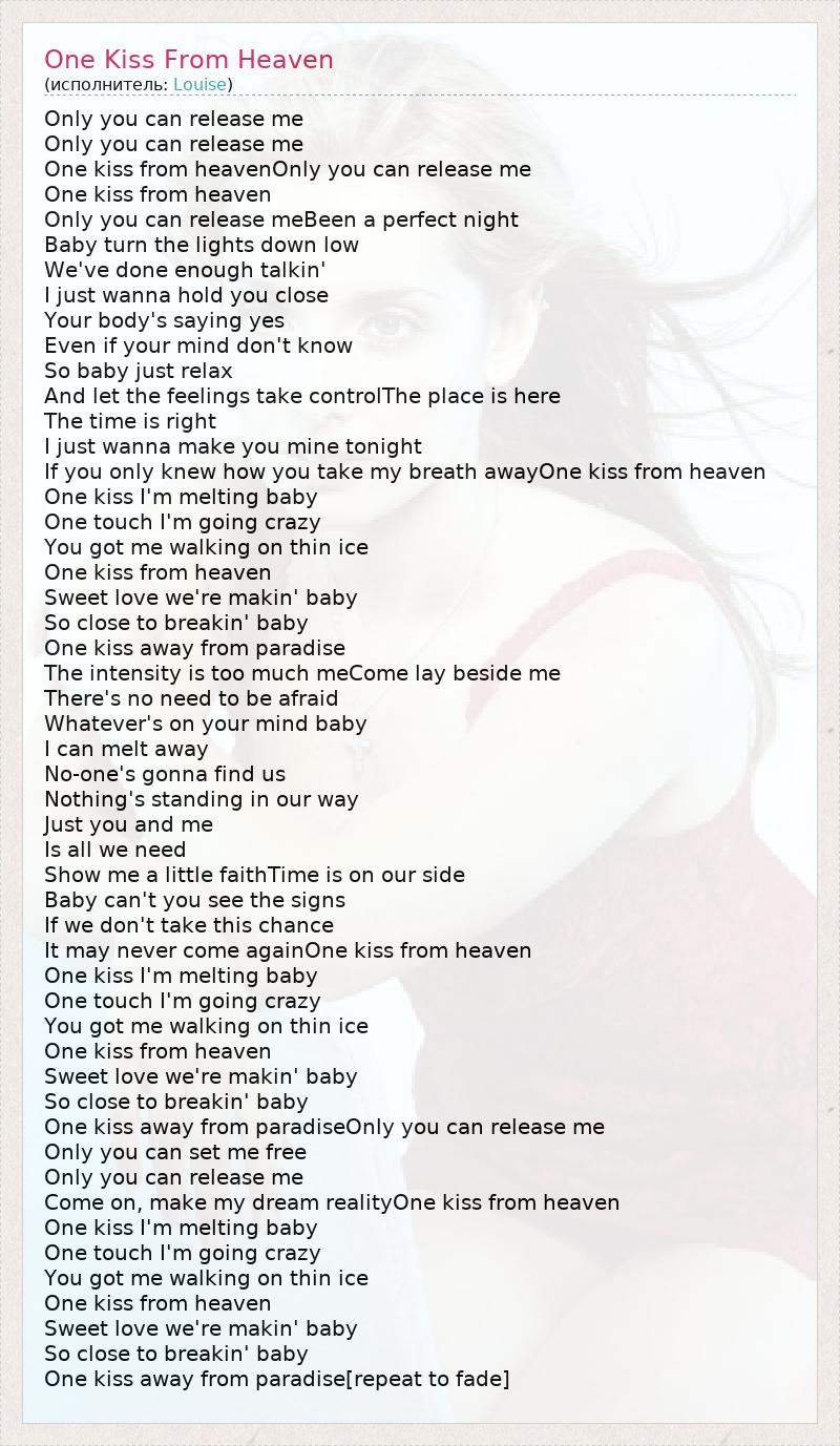 Only you can release me Only you can release me One kiss from heavenOnly you can release me One kiss from heaven Only you can release meBeen a perfect night Baby turn the lights down low We've done enough talkin' I just wanna hold you close Your body's saying yes Even if your mind don't know So baby just relax And let the feelings take controlThe place is here The time is right I just wanna make you mine tonight If you only knew how you take my breath awayOne kiss from heaven One kiss I'm melting baby One touch I'm going crazy You got me walking on thin ice One kiss from heaven Sweet love we're makin' baby So close to breakin' baby One kiss away from paradise The intensity is too much meCome lay beside me There's no need to be afraid Whatever's on your mind baby I can melt away No-one's gonna find us Nothing's standing in our way Just you and me Is all we need Show me a little faithTime is on our side Baby can't you see the signs If we don't take this chance It may never come againOne kiss from heaven One kiss I'm melting baby One touch I'm going crazy You got me walking on thin ice One kiss from heaven Sweet love we're makin' baby So close to breakin' baby One kiss away from paradiseOnly you can release me Only you can set me free Only you can release me Come on, make my dream realityOne kiss from heaven One kiss I'm melting baby One touch I'm going crazy You got me walking on thin ice One kiss from heaven Sweet love we're makin' baby So close to breakin' baby One kiss away from paradise[repeat to fade]