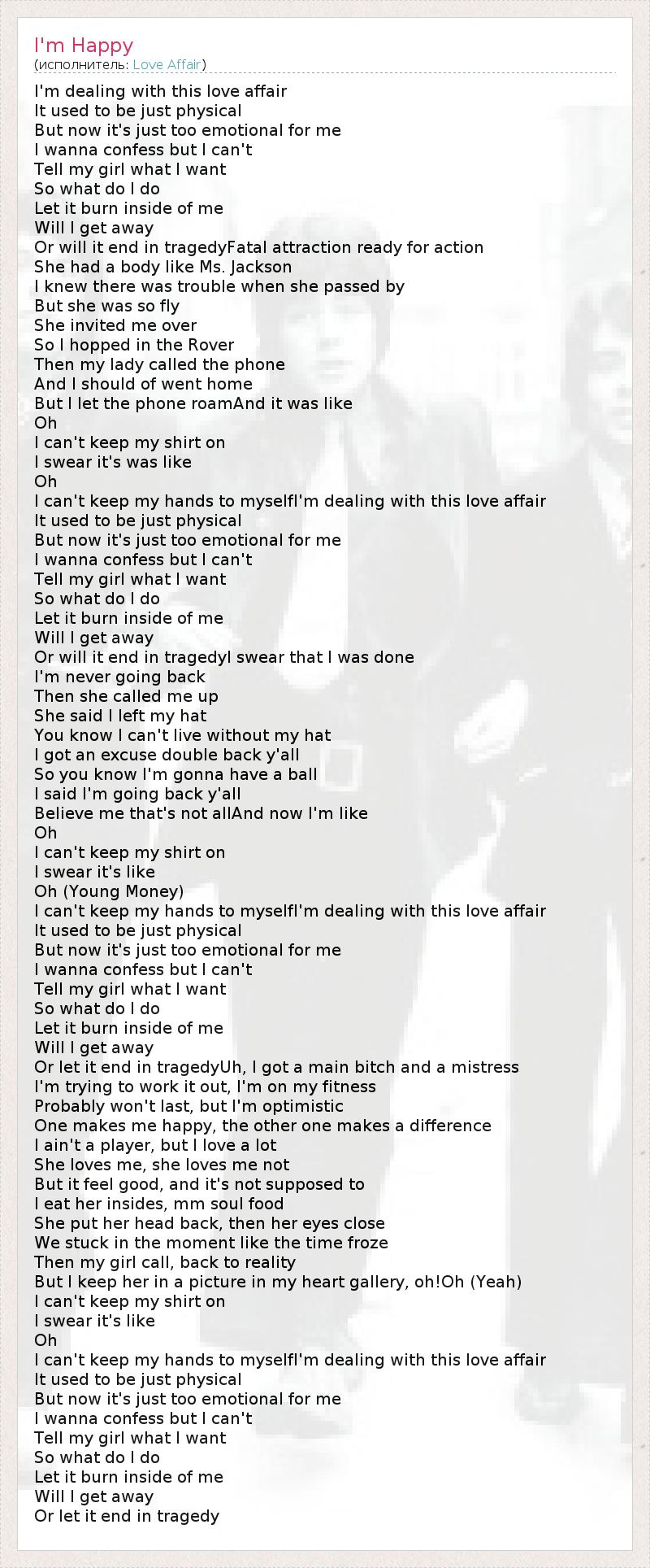 I'm dealing with this love affair It used to be just physical But now it's just too emotional for me I wanna confess but I can't Tell my girl what I want So what do I do Let it burn inside of me Will I get away Or will it end in tragedyFatal attraction ready for action She had a body like Ms. Jackson I knew there was trouble when she passed by But she was so fly She invited me over So I hopped in the Rover Then my lady called the phone And I should of went home But I let the phone roamAnd it was like Oh I can't keep my shirt on I swear it's was like Oh I can't keep my hands to myselfI'm dealing with this love affair It used to be just physical But now it's just too emotional for me I wanna confess but I can't Tell my girl what I want So what do I do Let it burn inside of me Will I get away Or will it end in tragedyI swear that I was done I'm never going back Then she called me up She said I left my hat You know I can't live without my hat I got an excuse double back y'all So you know I'm gonna have a ball I said I'm going back y'all Believe me that's not allAnd now I'm like Oh I can't keep my shirt on I swear it's like Oh (Young Money) I can't keep my hands to myselfI'm dealing with this love affair It used to be just physical But now it's just too emotional for me I wanna confess but I can't Tell my girl what I want So what do I do Let it burn inside of me Will I get away Or let it end in tragedyUh, I got a main bitch and a mistress I'm trying to work it out, I'm on my fitness Probably won't last, but I'm optimistic One makes me happy, the other one makes a difference I ain't a player, but I love a lot She loves me, she loves me not But it feel good, and it's not supposed to I eat her insides, mm soul food She put her head back, then her eyes close We stuck in the moment like the time froze Then my girl call, back to reality But I keep her in a picture in my heart gallery, oh!Oh (Yeah) I can't keep my shirt on I swear it's like Oh I can't keep my hands to myselfI'm dealing with this love affair It used to be just physical But now it's just too emotional for me I wanna confess but I can't Tell my girl what I want So what do I do Let it burn inside of me Will I get away Or let it end in tragedy