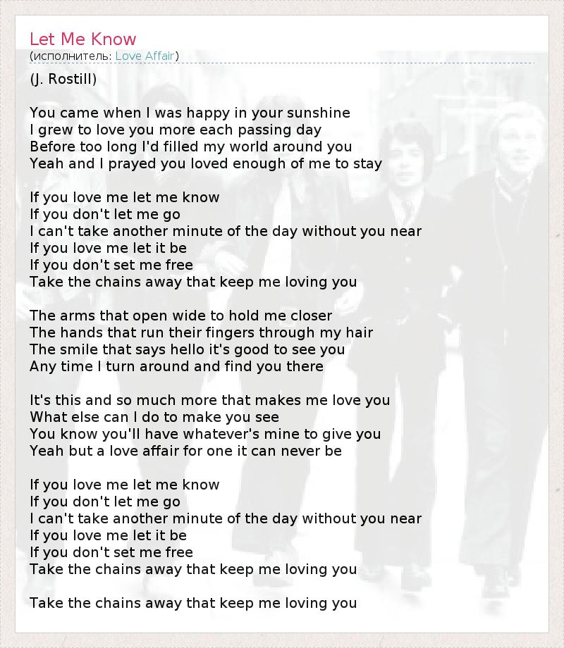 (J. Rostill) You came when I was happy in your sunshine I grew to love you more each passing day Before too long I'd filled my world around you Yeah and I prayed you loved enough of me to stay If you love me let me know If you don't let me go I can't take another minute of the day without you near If you love me let it be If you don't set me free Take the chains away that keep me loving you The arms that open wide to hold me closer The hands that run their fingers through my hair The smile that says hello it's good to see you Any time I turn around and find you there It's this and so much more that makes me love you What else can I do to make you see You know you'll have whatever's mine to give you Yeah but a love affair for one it can never be If you love me let me know If you don't let me go I can't take another minute of the day without you near If you love me let it be If you don't set me free Take the chains away that keep me loving you Take the chains away that keep me loving you