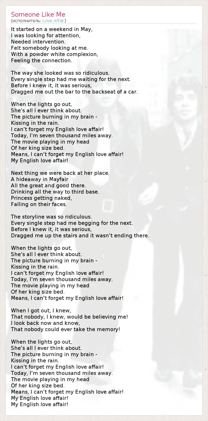 Всё началось в майский уикенд. Я искал внимания, Нуждался в участии. Почувствовал на себе взгляд незнакомки С белым от избытка пудры лицом, Ощутил с ней душевную связь. Она выглядела совершенно нелепо. С каждым новым шагом я уже ждал следующего. Прежде чем я понял, что всё серьёзно, Она вытащила меня из бара на заднее сидение машины. Когда гаснут огни, Она - всё, о чём я думаю. Мой мозг прожигает сцена Поцелуев под дождём. Я не могу забыть свою английскую любовь. Сегодня я в семи тысячах миль от неё, А в голове вертится картинка С её огромной двуспальной кроватью, А это значит, что я не могу забыть свою английскую любовь! Моя английская любовь! Потом мы поехали к ней - В укромный особняк в районе Мейфер. 1 Все собравшиеся там важные персоны Пили до полной кондиции. В итоге принцесса разделась догола, А остальные попадали ничком. Сюжет развивался анекдотично. Каждый новый шаг заставлял меня молить о следующем. Прежде чем я понял, что всё серьёзно, Она потащила меня вверх по лестнице, и это было только начало! Когда гаснут огни, Она - всё, о чём я думаю. Мой мозг прожигает сцена Поцелуев под дождём. Я не могу забыть свою английскую любовь. Сегодня я в семи тысячах миль от неё, А в голове вертится картинка С её огромной двуспальной кроватью, А это значит, что я не могу забыть свою английскую любовь! Когда я выбрался оттуда, я знал, Что мне никто не поверит! Но, оглядываясь назад, я понимаю, Что никто не сможет отнять у меня это воспоминание! Когда гаснут огни, Она - всё, о чём я думаю. Мой мозг прожигает сцена Поцелуев под дождём. Я не могу забыть свою английскую любовь. Сегодня я в семи тысячах миль от неё, А в голове вертится картинка С её огромной двуспальной кроватью, А это значит, что я не могу забыть свою английскую любовь! Моя английская любовь! Моя английская любовь! 1 - Mayfair - фешенебельный район Лондона