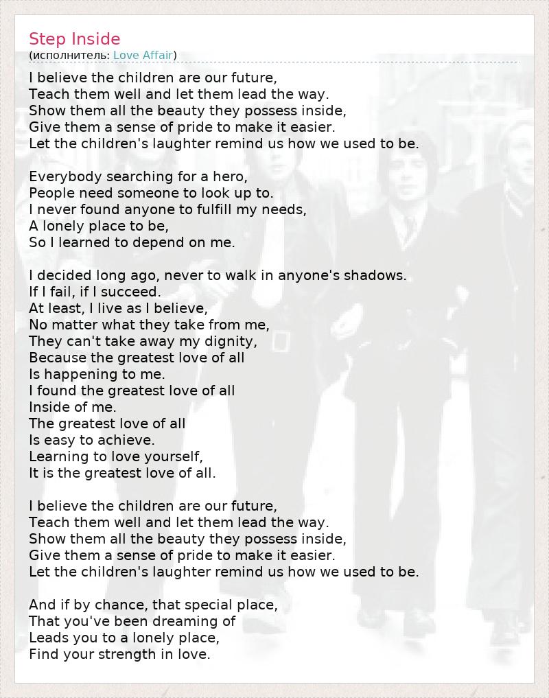 I believe the children are our future, Teach them well and let them lead the way. Show them all the beauty they possess inside, Give them a sense of pride to make it easier. Let the children's laughter remind us how we used to be. Everybody searching for a hero, People need someone to look up to. I never found anyone to fulfill my needs, A lonely place to be, So I learned to depend on me. I decided long ago, never to walk in anyone's shadows. If I fail, if I succeed. At least, I live as I believe, No matter what they take from me, They can't take away my dignity, Because the greatest love of all Is happening to me. I found the greatest love of all Inside of me. The greatest love of all Is easy to achieve. Learning to love yourself, It is the greatest love of all. I believe the children are our future, Teach them well and let them lead the way. Show them all the beauty they possess inside, Give them a sense of pride to make it easier. Let the children's laughter remind us how we used to be. And if by chance, that special place, That you've been dreaming of Leads you to a lonely place, Find your strength in love.