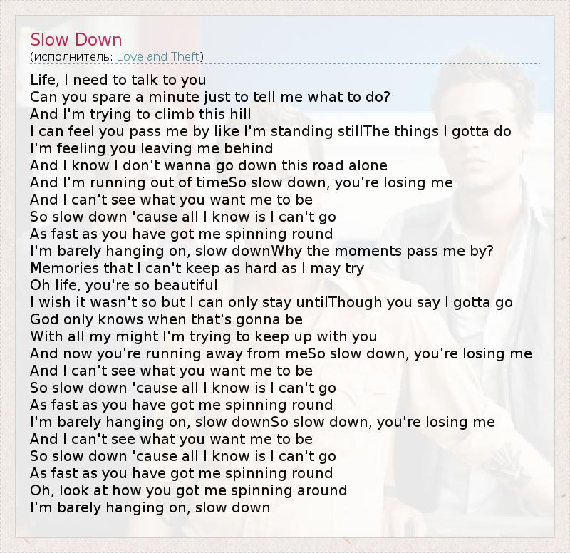 Life, I need to talk to you Can you spare a minute just to tell me what to do? And I'm trying to climb this hill I can feel you pass me by like I'm standing stillThe things I gotta do I'm feeling you leaving me behind And I know I don't wanna go down this road alone And I'm running out of timeSo slow down, you're losing me And I can't see what you want me to be So slow down 'cause all I know is I can't go As fast as you have got me spinning round I'm barely hanging on, slow downWhy the moments pass me by? Memories that I can't keep as hard as I may try Oh life, you're so beautiful I wish it wasn't so but I can only stay untilThough you say I gotta go God only knows when that's gonna be With all my might I'm trying to keep up with you And now you're running away from meSo slow down, you're losing me And I can't see what you want me to be So slow down 'cause all I know is I can't go As fast as you have got me spinning round I'm barely hanging on, slow downSo slow down, you're losing me And I can't see what you want me to be So slow down 'cause all I know is I can't go As fast as you have got me spinning round Oh, look at how you got me spinning around I'm barely hanging on, slow down