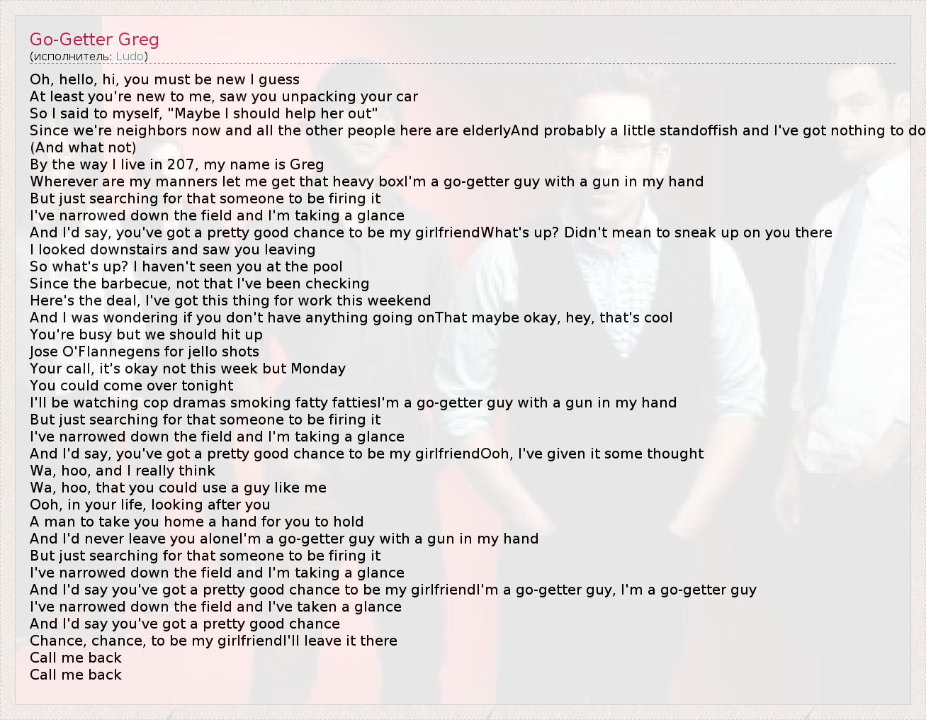 Oh, hello, hi, you must be new I guess At least you're new to me, saw you unpacking your car So I said to myself, "Maybe I should help her out" Since we're neighbors now and all the other people here are elderlyAnd probably a little standoffish and I've got nothing to do (And what not) By the way I live in 207, my name is Greg Wherever are my manners let me get that heavy boxI'm a go-getter guy with a gun in my hand But just searching for that someone to be firing it I've narrowed down the field and I'm taking a glance And I'd say, you've got a pretty good chance to be my girlfriendWhat's up? Didn't mean to sneak up on you there I looked downstairs and saw you leaving So what's up? I haven't seen you at the pool Since the barbecue, not that I've been checking Here's the deal, I've got this thing for work this weekend And I was wondering if you don't have anything going onThat maybe okay, hey, that's cool You're busy but we should hit up Jose O'Flannegens for jello shots Your call, it's okay not this week but Monday You could come over tonight I'll be watching cop dramas smoking fatty fattiesI'm a go-getter guy with a gun in my hand But just searching for that someone to be firing it I've narrowed down the field and I'm taking a glance And I'd say, you've got a pretty good chance to be my girlfriendOoh, I've given it some thought Wa, hoo, and I really think Wa, hoo, that you could use a guy like me Ooh, in your life, looking after you A man to take you home a hand for you to hold And I'd never leave you aloneI'm a go-getter guy with a gun in my hand But just searching for that someone to be firing it I've narrowed down the field and I'm taking a glance And I'd say you've got a pretty good chance to be my girlfriendI'm a go-getter guy, I'm a go-getter guy I've narrowed down the field and I've taken a glance And I'd say you've got a pretty good chance Chance, chance, to be my girlfriendI'll leave it there Call me back Call me back
