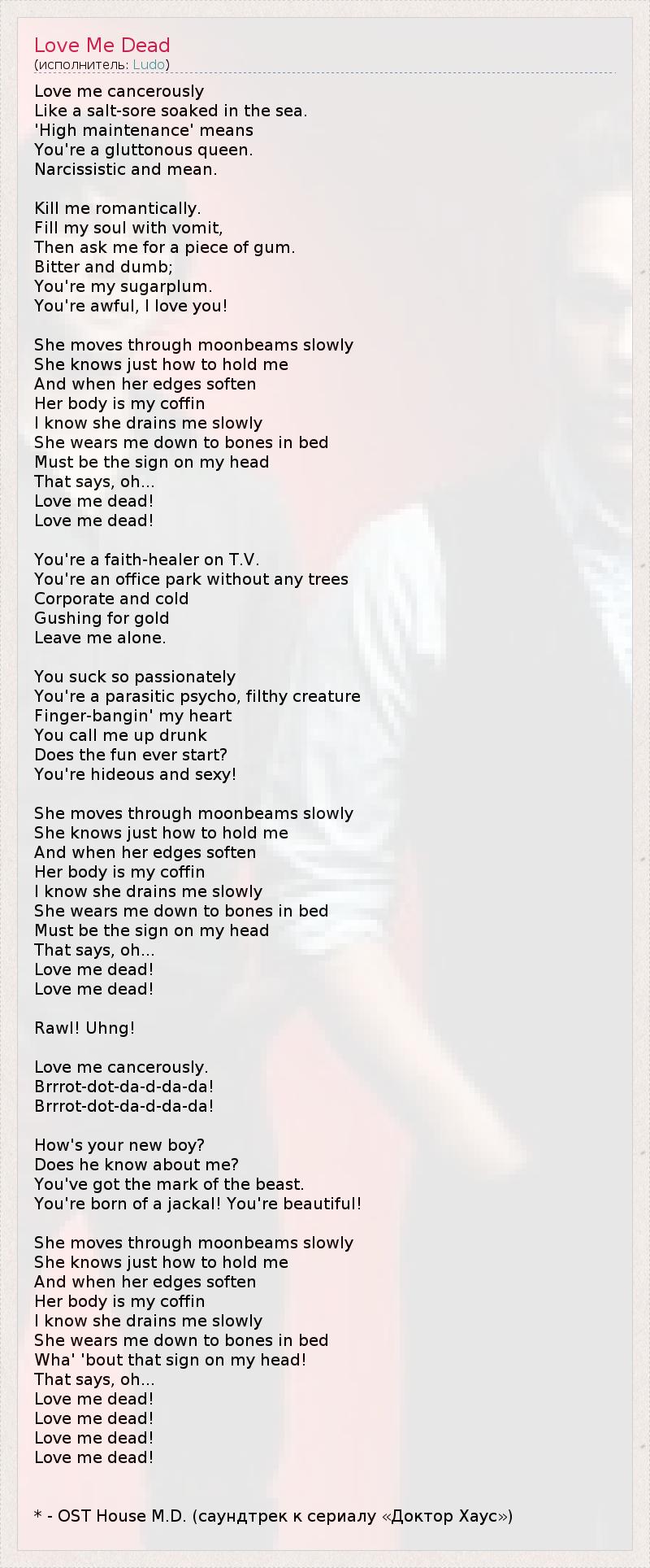Love me cancerously Like a salt-sore soaked in the sea. 'High maintenance' means You're a gluttonous queen. Narcissistic and mean. Kill me romantically. Fill my soul with vomit, Then ask me for a piece of gum. Bitter and dumb; You're my sugarplum. You're awful, I love you! She moves through moonbeams slowly She knows just how to hold me And when her edges soften Her body is my coffin I know she drains me slowly She wears me down to bones in bed Must be the sign on my head That says, oh... Love me dead! Love me dead! You're a faith-healer on T.V. You're an office park without any trees Corporate and cold Gushing for gold Leave me alone. You suck so passionately You're a parasitic psycho, filthy creature Finger-bangin' my heart You call me up drunk Does the fun ever start? You're hideous and sexy! She moves through moonbeams slowly She knows just how to hold me And when her edges soften Her body is my coffin I know she drains me slowly She wears me down to bones in bed Must be the sign on my head That says, oh... Love me dead! Love me dead! Rawl! Uhng! Love me cancerously. Brrrot-dot-da-d-da-da! Brrrot-dot-da-d-da-da! How's your new boy? Does he know about me? You've got the mark of the beast. You're born of a jackal! You're beautiful! She moves through moonbeams slowly She knows just how to hold me And when her edges soften Her body is my coffin I know she drains me slowly She wears me down to bones in bed Wha' 'bout that sign on my head! That says, oh... Love me dead! Love me dead! Love me dead! Love me dead! * - OST House M.D. (саундтрек к сериалу «Доктор Хаус»)