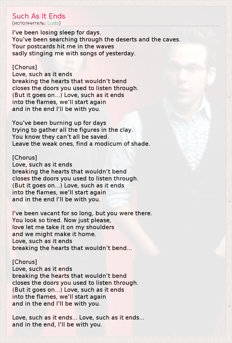 I've been losing sleep for days. You've been searching through the deserts and the caves. Your postcards hit me in the waves sadly stinging me with songs of yesterday. [Chorus] Love, such as it ends breaking the hearts that wouldn't bend closes the doors you used to listen through. (But it goes on...) Love, such as it ends into the flames, we'll start again and in the end I'll be with you. You've been burning up for days trying to gather all the figures in the clay. You know they can't all be saved. Leave the weak ones, find a modicum of shade. [Chorus] Love, such as it ends breaking the hearts that wouldn't bend closes the doors you used to listen through. (But it goes on...) Love, such as it ends into the flames, we'll start again and in the end I'll be with you. I've been vacant for so long, but you were there. You look so tired. Now just please, love let me take it on my shoulders and we might make it home. Love, such as it ends breaking the hearts that wouldn't bend... [Chorus] Love, such as it ends breaking the hearts that wouldn't bend closes the doors you used to listen through. (But it goes on...) Love, such as it ends into the flames, we'll start again and in the end I'll be with you. Love, such as it ends... Love, such as it ends... and in the end, I'll be with you.