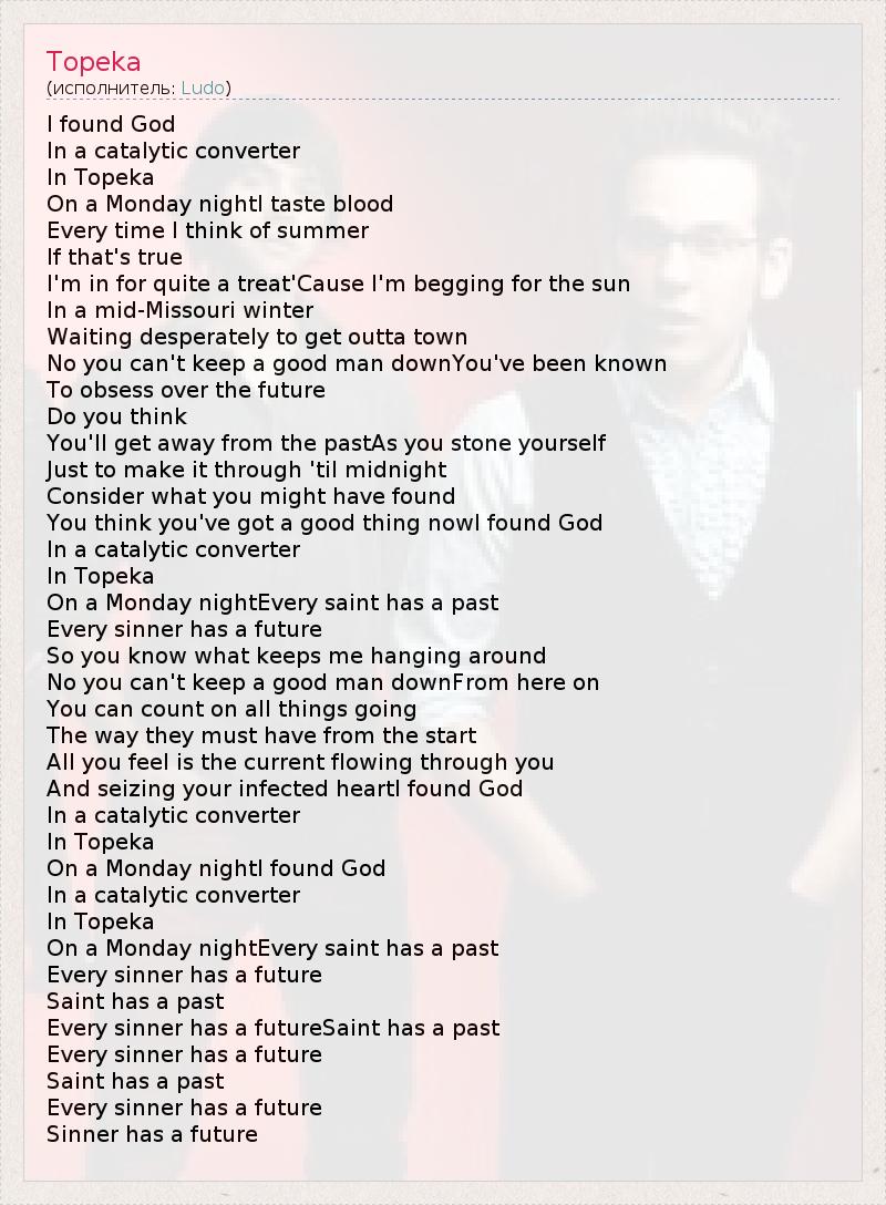 I found God In a catalytic converter In Topeka On a Monday nightI taste blood Every time I think of summer If that's true I'm in for quite a treat'Cause I'm begging for the sun In a mid-Missouri winter Waiting desperately to get outta town No you can't keep a good man downYou've been known To obsess over the future Do you think You'll get away from the pastAs you stone yourself Just to make it through 'til midnight Consider what you might have found You think you've got a good thing nowI found God In a catalytic converter In Topeka On a Monday nightEvery saint has a past Every sinner has a future So you know what keeps me hanging around No you can't keep a good man downFrom here on You can count on all things going The way they must have from the start All you feel is the current flowing through you And seizing your infected heartI found God In a catalytic converter In Topeka On a Monday nightI found God In a catalytic converter In Topeka On a Monday nightEvery saint has a past Every sinner has a future Saint has a past Every sinner has a futureSaint has a past Every sinner has a future Saint has a past Every sinner has a future Sinner has a future