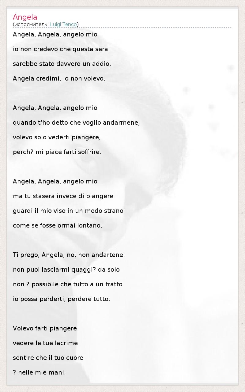 Angela, Angela, angelo mio io non credevo che questa sera sarebbe stato davvero un addio, Angela credimi, io non volevo. Angela, Angela, angelo mio quando t'ho detto che voglio andarmene, volevo solo vederti piangere, perch? mi piace farti soffrire. Angela, Angela, angelo mio ma tu stasera invece di piangere guardi il mio viso in un modo strano come se fosse ormai lontano. Ti prego, Angela, no, non andartene non puoi lasciarmi quaggi? da solo non ? possibile che tutto a un tratto io possa perderti, perdere tutto. Volevo farti piangere vedere le tue lacrime sentire che il tuo cuore ? nelle mie mani.