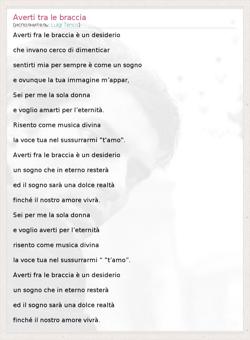 Averti От Le локтей è ООН Десидерио че invano Вы ищете ди dimenticar sentirti Mia в Semper è приходят ип Sogno е ovunque ла Туа Immagine m'appar , Sei за меня ла Сола Донна е Voglio Amarti в l' eternità . Risento приходят Musica Divina ла Voce Туа -нель- sussurrarmi и Quot; t'amo и Quot ;. Averti От Le локтей è ООН Десидерио ООН Sogno че в Eterno resterà ред Il Sogno sarà Una Dolce Реалта finché IL ностро напиток vivrà . Sei за меня ла Сола Донна е Voglio averti в l' eternità risento приходят Musica Divina ла Voce Туа -нель- sussurrarmi " и Quot; t'amo " . Averti От Le локтей è ООН Десидерио ООН Sogno че в Eterno resterà ред Il Sogno sarà Una Dolce Реалта finché IL ностро напиток vivrà .