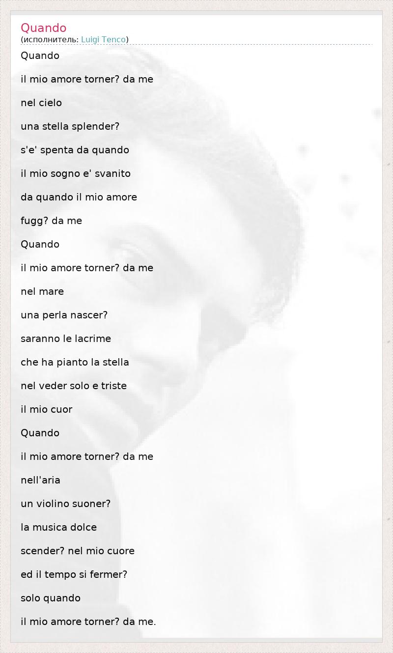 Quando il mio amore torner? da me nel cielo una stella splender? s'e' spenta da quando il mio sogno e' svanito da quando il mio amore fugg? da me Quando il mio amore torner? da me nel mare una perla nascer? saranno le lacrime che ha pianto la stella nel veder solo e triste il mio cuor Quando il mio amore torner? da me nell'aria un violino suoner? la musica dolce scender? nel mio cuore ed il tempo si fermer? solo quando il mio amore torner? da me.