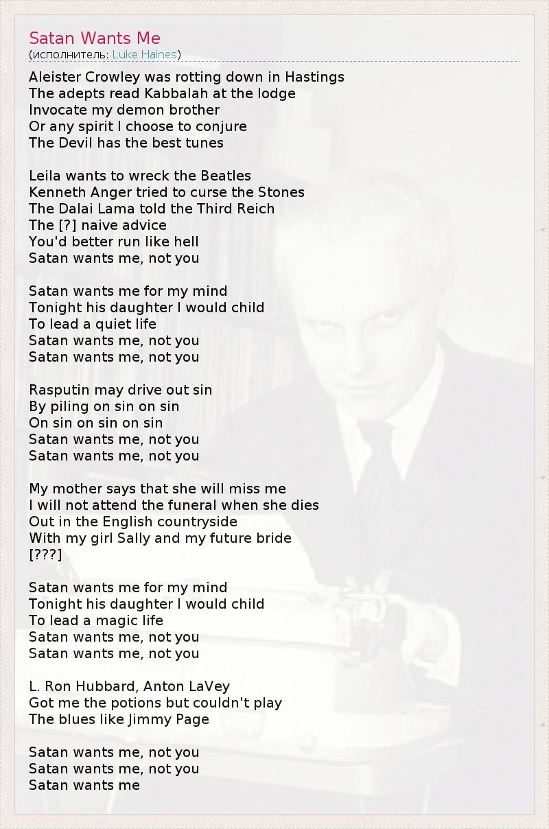 Aleister Crowley was rotting down in Hastings The adepts read Kabbalah at the lodge Invocate my demon brother Or any spirit I choose to conjure The Devil has the best tunes Leila wants to wreck the Beatles Kenneth Anger tried to curse the Stones The Dalai Lama told the Third Reich The [?] naive advice You'd better run like hell Satan wants me, not you Satan wants me for my mind Tonight his daughter I would child To lead a quiet life Satan wants me, not you Satan wants me, not you Rasputin may drive out sin By piling on sin on sin On sin on sin on sin Satan wants me, not you Satan wants me, not you My mother says that she will miss me I will not attend the funeral when she dies Out in the English countryside With my girl Sally and my future bride [???] Satan wants me for my mind Tonight his daughter I would child To lead a magic life Satan wants me, not you Satan wants me, not you L. Ron Hubbard, Anton LaVey Got me the potions but couldn't play The blues like Jimmy Page Satan wants me, not you Satan wants me, not you Satan wants me