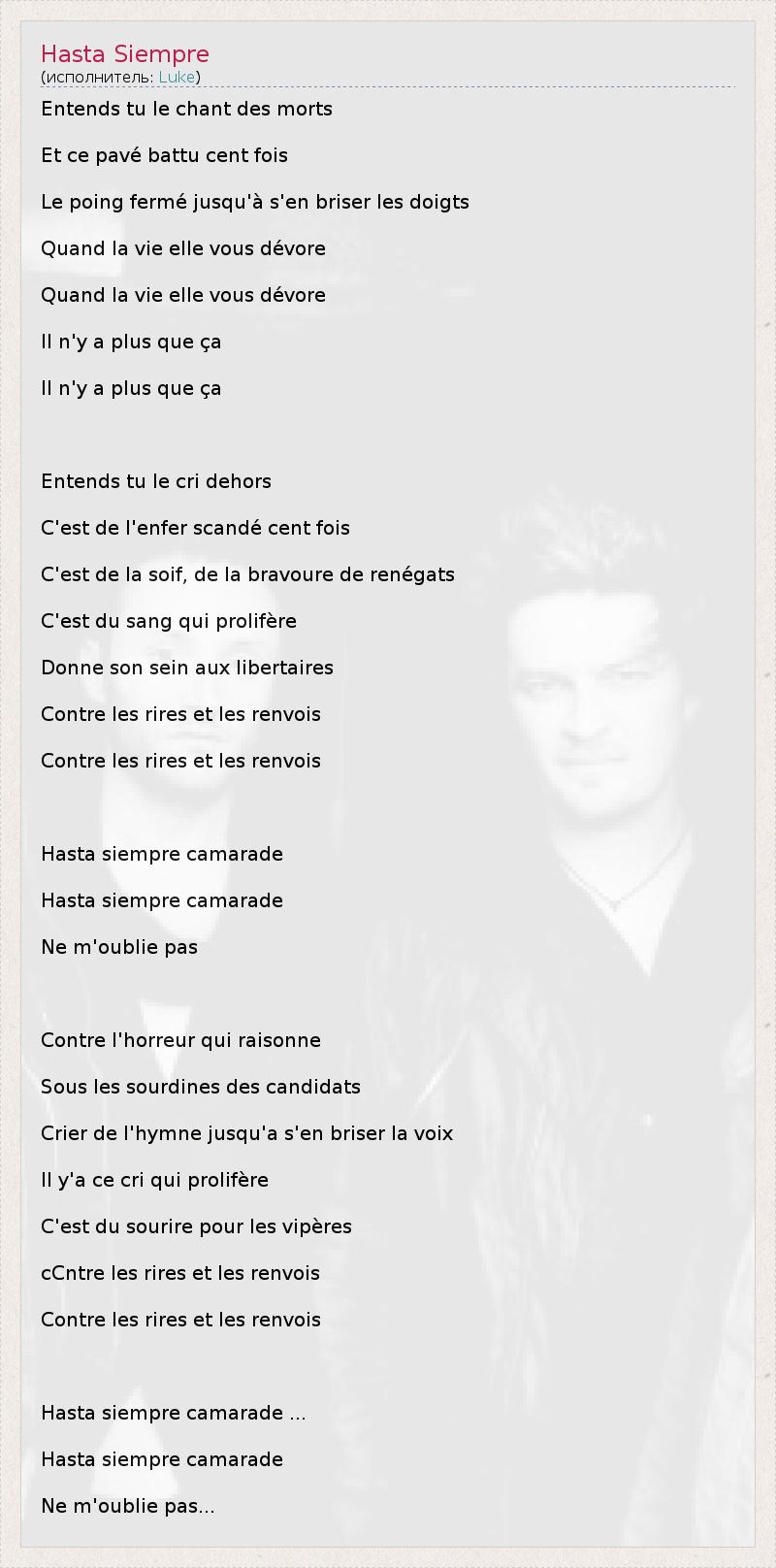 Entends tu le chant des morts Et ce pavé battu cent fois Le poing fermé jusqu'à s'en briser les doigts Quand la vie elle vous dévore Quand la vie elle vous dévore Il n'y a plus que ça Il n'y a plus que ça Entends tu le cri dehors C'est de l'enfer scandé cent fois C'est de la soif, de la bravoure de renégats C'est du sang qui prolifère Donne son sein aux libertaires Contre les rires et les renvois Contre les rires et les renvois Hasta siempre camarade Hasta siempre camarade Ne m'oublie pas Contre l'horreur qui raisonne Sous les sourdines des candidats Crier de l'hymne jusqu'a s'en briser la voix Il y'a ce cri qui prolifère C'est du sourire pour les vipères cCntre les rires et les renvois Contre les rires et les renvois Hasta siempre camarade ... Hasta siempre camarade Ne m'oublie pas...