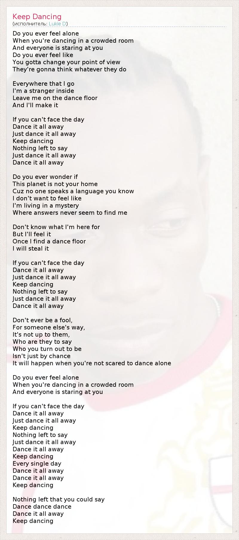Вы когда-нибудь чувствовали себя одинокими, Танцуя в наполненном людьми месте, Когда все уставились на вас? Вы когда-нибудь чувствовали себя так, словно Вы должны изменить свою точку зрения, А остальные будут думать, что хотят Куда бы я ни пошла, Я везде чужая. Оставьте меня на танцполе, И я сделаю это! Если не можете встретить день - Танцуйте, Просто танцуйте, Продолжайте танцевать! Нечего сказать - Просто танцуйте, Танцуйте! Вы никогда не думали, что, может, Эта планета — не ваш дом, Ведь все говорят на языках, которые вы не понимаете? Я не хочу чувствовать себя так, словно Я живу в неизвестности, Где ответы никогда не найдут меня Я не знаю, что я тут делаю, Но я пойму. Если я однажды найду танцпол - Я смогу затмить всех. Если не можете встретить день - Танцуйте, Просто танцуйте, Продолжайте танцевать! Нечего сказать - Просто танцуйте, Танцуйте! Никогда не будьте настолько глупы, Чтобы жить под чью-то диктовку! Не им решать, Кто они такие, чтобы говорить, Кем вам быть? И не случайно Вы поймете это, когда не испугаетесь танцевать в одиночестве! Вы когда-нибудь чувствовали себя одинокими, Танцуя в наполненном людьми месте, Когда все уставились на вас? Если не можете встретить день - Танцуйте, Просто танцуйте, Продолжайте танцевать! Нечего сказать - Просто танцуйте, Танцуйте! Продолжайте танцевать! Каждый день, Танцуйте, Танцуйте, Продолжайте танцевать! Больше нечего сказать - Танцуйте, танцуйте, танцуйте, Танцуйте, Продолжайте танцевать!