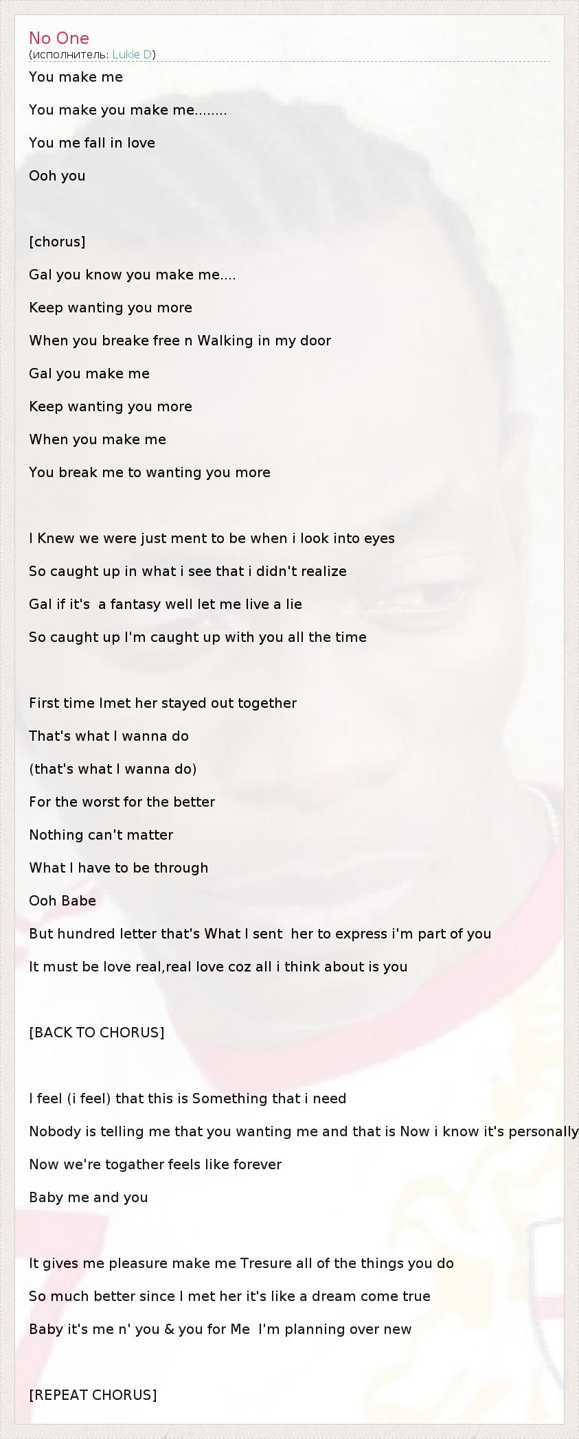 You make me You make you make me........ You me fall in love Ooh you [chorus] Gal you know you make me.... Keep wanting you more When you breake free n Walking in my door Gal you make me Keep wanting you more When you make me You break me to wanting you more I Knew we were just ment to be when i look into eyes So caught up in what i see that i didn't realize Gal if it's a fantasy well let me live a lie So caught up I'm caught up with you all the time First time Imet her stayed out together That's what I wanna do (that's what I wanna do) For the worst for the better Nothing can't matter What I have to be through Ooh Babe But hundred letter that's What I sent her to express i'm part of you It must be love real,real love coz all i think about is you [BACK TO CHORUS] I feel (i feel) that this is Something that i need Nobody is telling me that you wanting me and that is Now i know it's personally Now we're togather feels like forever Baby me and you It gives me pleasure make me Tresure all of the things you do So much better since I met her it's like a dream come true Baby it's me n' you & you for Me I'm planning over new [REPEAT CHORUS]
