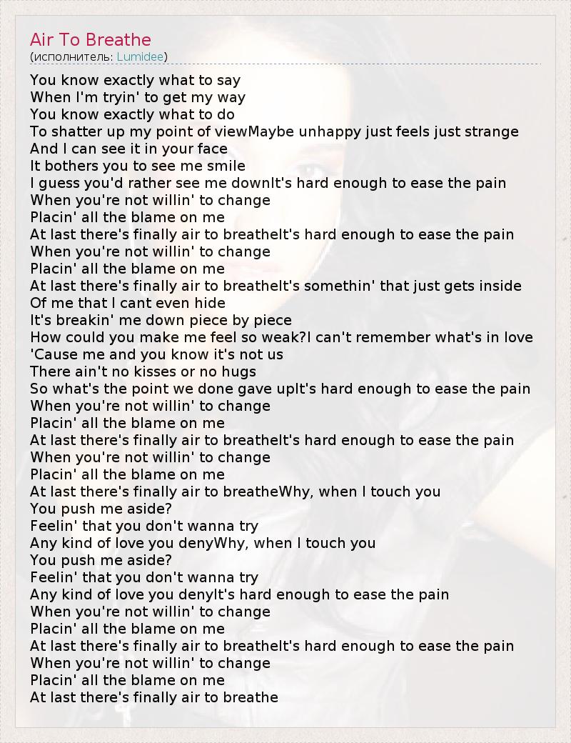 You know exactly what to say When I'm tryin' to get my way You know exactly what to do To shatter up my point of viewMaybe unhappy just feels just strange And I can see it in your face It bothers you to see me smile I guess you'd rather see me downIt's hard enough to ease the pain When you're not willin' to change Placin' all the blame on me At last there's finally air to breatheIt's hard enough to ease the pain When you're not willin' to change Placin' all the blame on me At last there's finally air to breatheIt's somethin' that just gets inside Of me that I cant even hide It's breakin' me down piece by piece How could you make me feel so weak?I can't remember what's in love 'Cause me and you know it's not us There ain't no kisses or no hugs So what's the point we done gave upIt's hard enough to ease the pain When you're not willin' to change Placin' all the blame on me At last there's finally air to breatheIt's hard enough to ease the pain When you're not willin' to change Placin' all the blame on me At last there's finally air to breatheWhy, when I touch you You push me aside? Feelin' that you don't wanna try Any kind of love you denyWhy, when I touch you You push me aside? Feelin' that you don't wanna try Any kind of love you denyIt's hard enough to ease the pain When you're not willin' to change Placin' all the blame on me At last there's finally air to breatheIt's hard enough to ease the pain When you're not willin' to change Placin' all the blame on me At last there's finally air to breathe
