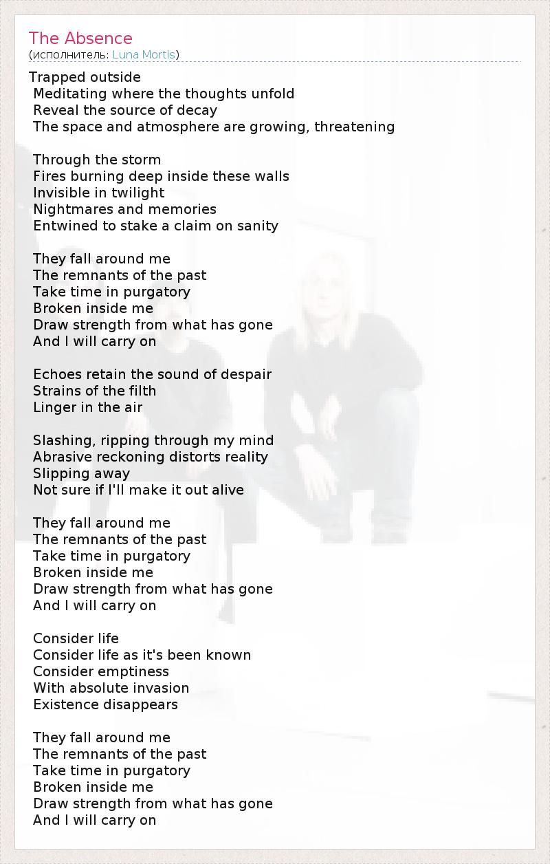 Это интересно:Luna Mortis происходит из г. Мэдисон, США. Одновременно мелодичный и абразивный, техничный и привлекательный, квинтет с женщиной-вокалисткой. Международное признание пришло к группе с выпуском в 2006 году изданной самостоятельно LP "Way of the Blade". К середине 2007 года группа получила достаточные известность и славу, чтобы привлечь существенный интерес лейбла. 15 февраля 2010 года было объявлено... продолжение