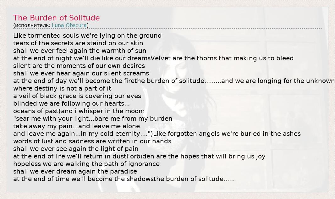 Like tormented souls we're lying on the ground tears of the secrets are staind on our skin shall we ever feel again the warmth of sun at the end of night we'll die like our dreamsVelvet are the thorns that making us to bleed silent are the moments of our own desires shall we ever hear again our silent screams at the end of day we'll become the firethe burden of solitude.........and we are longing for the unknown where destiny is not a part of it a veil of black grace is covering our eyes blinded we are following our hearts... oceans of past(and i whisper in the moon: "sear me with your light...bare me from my burden take away my pain...and leave me alone and leave me again...in my cold eternity....")Like forgotten angels we're buried in the ashes words of lust and sadness are written in our hands shall we ever see again the light of pain at the end of life we'll return in dustForbiden are the hopes that will bring us joy hopeless we are walking the path of ignorance shall we ever dream again the paradise at the end of time we'll become the shadowsthe burden of solitude......