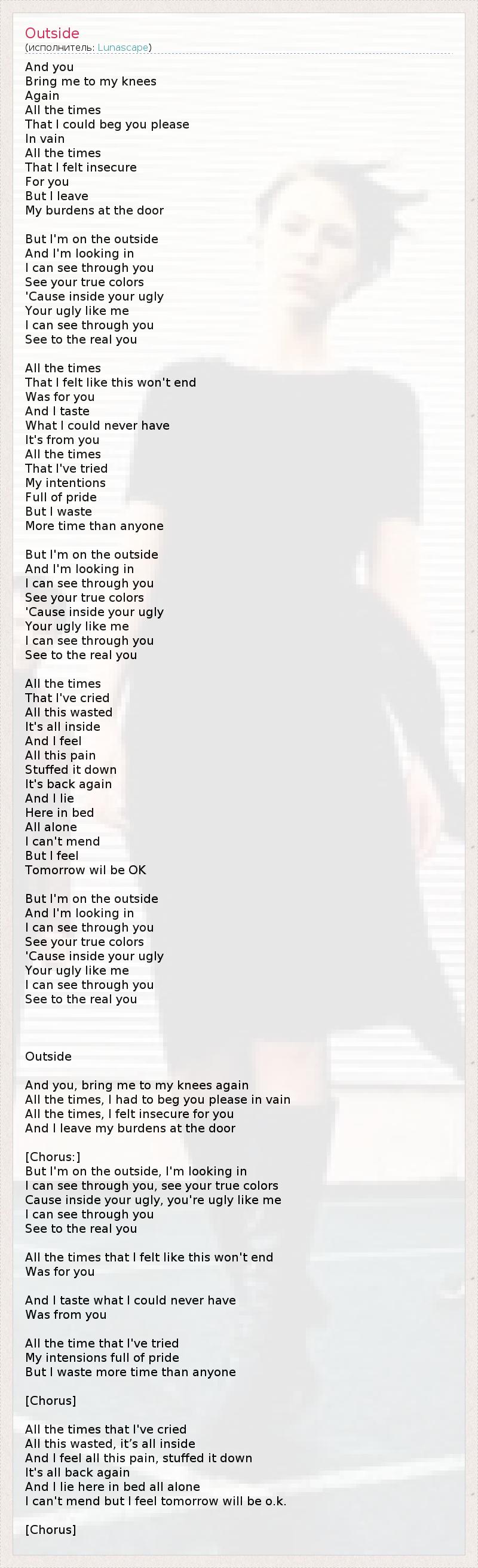 And you Bring me to my knees Again All the times That I could beg you please In vain All the times That I felt insecure For you But I leave My burdens at the door But I'm on the outside And I'm looking in I can see through you See your true colors 'Cause inside your ugly Your ugly like me I can see through you See to the real you All the times That I felt like this won't end Was for you And I taste What I could never have It's from you All the times That I've tried My intentions Full of pride But I waste More time than anyone But I'm on the outside And I'm looking in I can see through you See your true colors 'Cause inside your ugly Your ugly like me I can see through you See to the real you All the times That I've cried All this wasted It's all inside And I feel All this pain Stuffed it down It's back again And I lie Here in bed All alone I can't mend But I feel Tomorrow wil be OK But I'm on the outside And I'm looking in I can see through you See your true colors 'Cause inside your ugly Your ugly like me I can see through you See to the real you Outside And you, bring me to my knees again All the times, I had to beg you please in vain All the times, I felt insecure for you And I leave my burdens at the door [Chorus:] But I'm on the outside, I'm looking in I can see through you, see your true colors Cause inside your ugly, you're ugly like me I can see through you See to the real you All the times that I felt like this won't end Was for you And I taste what I could never have Was from you All the time that I've tried My intensions full of pride But I waste more time than anyone [Chorus] All the times that I've cried All this wasted, it’s all inside And I feel all this pain, stuffed it down It's all back again And I lie here in bed all alone I can't mend but I feel tomorrow will be o.k. [Chorus]