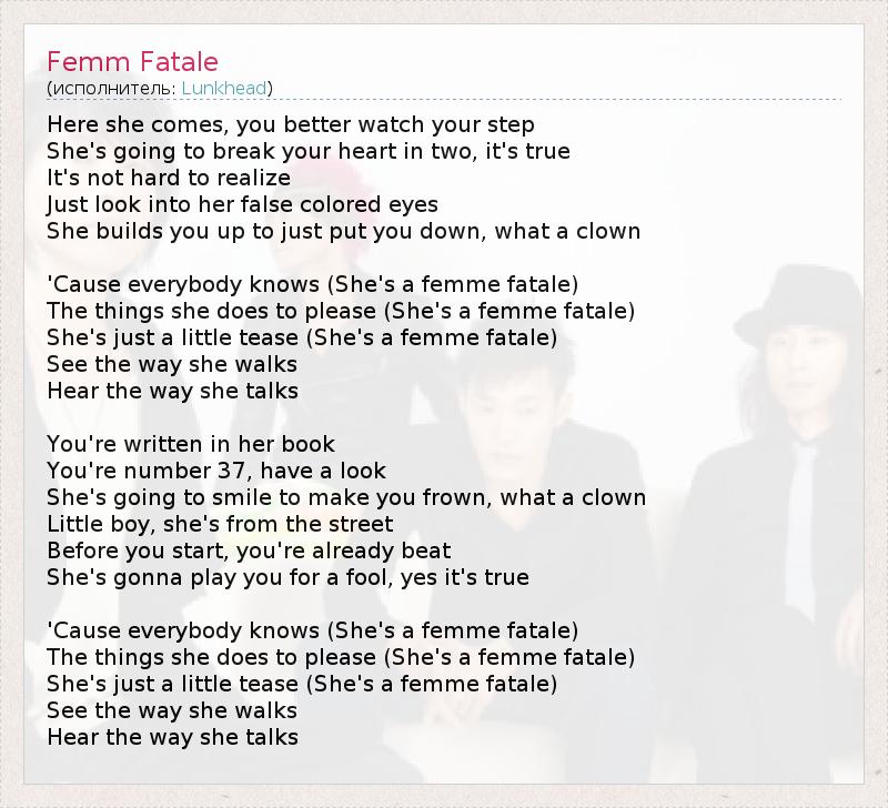 Here she comes, you better watch your step She's going to break your heart in two, it's true It's not hard to realize Just look into her false colored eyes She builds you up to just put you down, what a clown 'Cause everybody knows (She's a femme fatale) The things she does to please (She's a femme fatale) She's just a little tease (She's a femme fatale) See the way she walks Hear the way she talks You're written in her book You're number 37, have a look She's going to smile to make you frown, what a clown Little boy, she's from the street Before you start, you're already beat She's gonna play you for a fool, yes it's true 'Cause everybody knows (She's a femme fatale) The things she does to please (She's a femme fatale) She's just a little tease (She's a femme fatale) See the way she walks Hear the way she talks