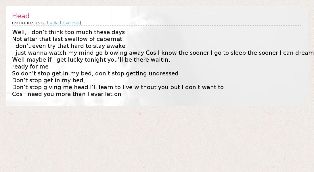 Well, I don't think too much these days Not after that last swallow of cabernet I don't even try that hard to stay awake I just wanna watch my mind go blowing away.Cos I know the sooner I go to sleep the sooner I can dream Well maybe if I get lucky tonight you'll be there waitin, ready for me So don't stop get in my bed, don't stop getting undressed Don't stop get in my bed, Don't stop giving me head.I'll learn to live without you but I don't want to Cos I need you more than I ever let on