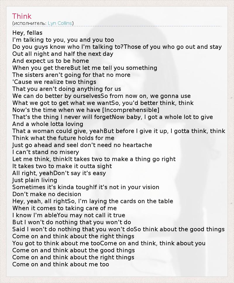 Hey, fellas I'm talking to you, you and you too Do you guys know who I'm talking to?Those of you who go out and stay Out all night and half the next day And expect us to be home When you get thereBut let me tell you something The sisters aren't going for that no more 'Cause we realize two things That you aren't doing anything for us We can do better by ourselvesSo from now on, we gonna use What we got to get what we wantSo, you'd better think, think Now's the time when we have [Incomprehensible] That's the thing I never will forgetNow baby, I got a whole lot to give And a whole lotta loving That a woman could give, yeahBut before I give it up, I gotta think, think Think what the future holds for me Just go ahead and seeI don't need no heartache I can't stand no misery Let me think, thinkIt takes two to make a thing go right It takes two to make it outta sight All right, yeahDon't say it's easy Just plain living Sometimes it's kinda toughIf it's not in your vision Don't make no decision Hey, yeah, all rightSo, I'm laying the cards on the table When it comes to taking care of me I know I'm ableYou may not call it true But I won't do nothing that you won't do Said I won't do nothing that you won't doSo think about the good things Come on and think about the right things You got to think about me tooCome on and think, think about you Come on and think about the good things Come on and think about the right things Come on and think about me too