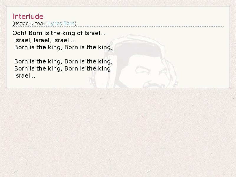 Ooh! Born is the king of Israel... Israel, Israel, Israel... Born is the king, Born is the king, Born is the king, Born is the king, Born is the king, Born is the king Israel...