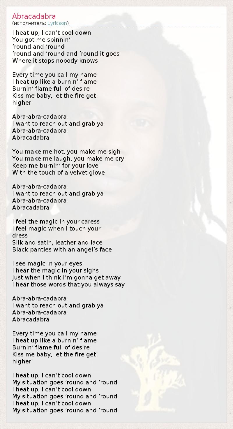Абракадабра Я вспыхиваю, я не могу остыть, ты окрутила меня круг за кругом круг за кругом, и еще круг никто не знает когда это прекратится Каждый раз когда ты зовешь меня по имени я вспыхиваю как огонь огонь, полный желания поцелуй меня, детка, чтобы огонь разгорелся еще сильнее Абра- абра- кадабра я хочу настичь и схватить тебя Абра- абра- кадабра Абракадабра ты меня зажигаешь, заставляешь вздыхать ты заставляешь смеяться, заставляешь плакать поддерживай огонь мой любви прикосновением бархатной перчатки Абра- абра- кадабра я хочу настичь и схватить тебя Абра- абра- кадабра Абракадабра Я чувствую магию в твоих ласках Я чувствую магию когда дотрагиваюсь до твоего платья Шелк и атлас , кожа и кружева, черное белье и ангельское личико Я вижу магию в твоих глазах я слышу магию в твоих вздохах Как только я думаю, что готов уйти Я слышу слова, которые ты всегда говоришь Абра- абра- кадабра я хочу настичь и схватить тебя Абра- абра- кадабра Абракадабра Каждый раз когда ты зовешь меня по имени я вспыхиваю как огонь огонь, полный желания поцелуй меня, детка, чтобы огонь разгорелся еще сильнее Я воспламеняюсь, я не могу остыть я попал в замкнутый круг Я воспламеняюсь, я не могу остыть я попал в замкнутый круг Я воспламеняюсь, я не могу остыть я попал в замкнутый круг Перевод: Юлия