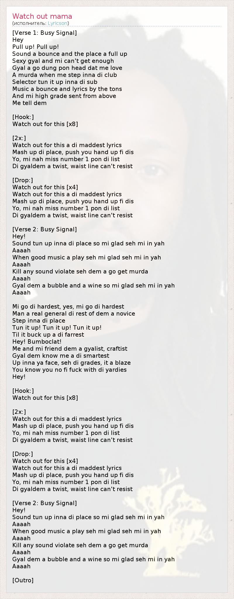 [Verse 1: Busy Signal] Hey Pull up! Pull up! Sound a bounce and the place a full up Sexy gyal and mi can't get enough Gyal a go dung pon head dat me love A murda when me step inna di club Selector tun it up inna di sub Music a bounce and lyrics by the tons And mi high grade sent from above Me tell dem [Hook:] Watch out for this [x8] [2x:] Watch out for this a di maddest lyrics Mash up di place, push you hand up fi dis Yo, mi nah miss number 1 pon di list Di gyaldem a twist, waist line can't resist [Drop:] Watch out for this [x4] Watch out for this a di maddest lyrics Mash up di place, push you hand up fi dis Yo, mi nah miss number 1 pon di list Di gyaldem a twist, waist line can't resist [Verse 2: Busy Signal] Hey! Sound tun up inna di place so mi glad seh mi in yah Aaaah When good music a play seh mi glad seh mi in yah Aaaah Kill any sound violate seh dem a go get murda Aaaah Gyal dem a bubble and a wine so mi glad seh mi in yah Aaaah Mi go di hardest, yes, mi go di hardest Man a real general di rest of dem a novice Step inna di place Tun it up! Tun it up! Tun it up! Til it buck up a di farrest Hey! Bumboclat! Me and mi friend dem a gyalist, craftist Gyal dem know me a di smartest Up inna ya face, seh di grades, it a blaze You know you no fi fuck with di yardies Hey! [Hook:] Watch out for this [x8] [2x:] Watch out for this a di maddest lyrics Mash up di place, push you hand up fi dis Yo, mi nah miss number 1 pon di list Di gyaldem a twist, waist line can't resist [Drop:] Watch out for this [x4] Watch out for this a di maddest lyrics Mash up di place, push you hand up fi dis Yo, mi nah miss number 1 pon di list Di gyaldem a twist, waist line can't resist [Verse 2: Busy Signal] Hey! Sound tun up inna di place so mi glad seh mi in yah Aaaah When good music a play seh mi glad seh mi in yah Aaaah Kill any sound violate seh dem a go get murda Aaaah Gyal dem a bubble and a wine so mi glad seh mi in yah Aaaah [Outro]