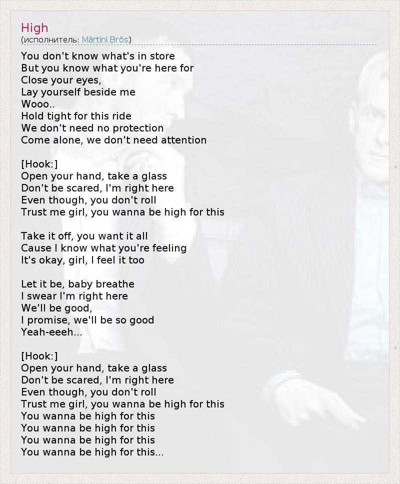 You don't know what's in store But you know what you're here for Close your eyes, Lay yourself beside me Wooo.. Hold tight for this ride We don't need no protection Come alone, we don't need attention [Hook:] Open your hand, take a glass Don't be scared, I'm right here Even though, you don't roll Trust me girl, you wanna be high for this Take it off, you want it all Cause I know what you're feeling It's okay, girl, I feel it too Let it be, baby breathe I swear I'm right here We'll be good, I promise, we'll be so good Yeah-eeeh... [Hook:] Open your hand, take a glass Don't be scared, I'm right here Even though, you don't roll Trust me girl, you wanna be high for this You wanna be high for this You wanna be high for this You wanna be high for this You wanna be high for this...