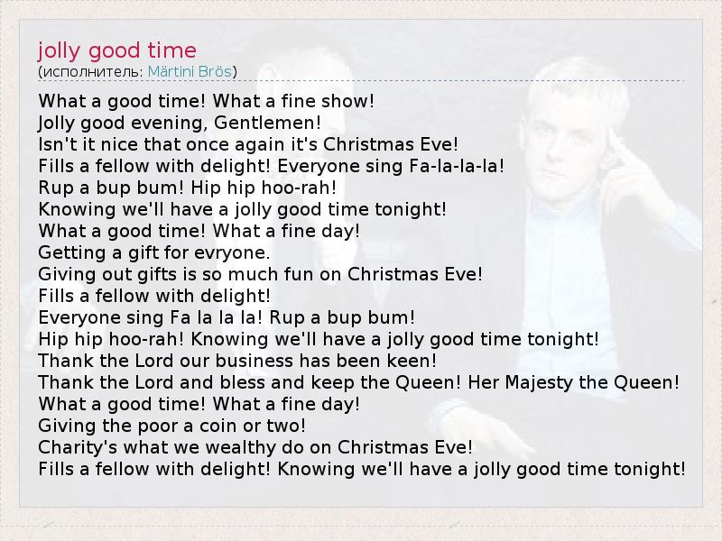 What a good time! What a fine show! Jolly good evening, Gentlemen! Isn't it nice that once again it's Christmas Eve! Fills a fellow with delight! Everyone sing Fa-la-la-la! Rup a bup bum! Hip hip hoo-rah! Knowing we'll have a jolly good time tonight! What a good time! What a fine day! Getting a gift for evryone. Giving out gifts is so much fun on Christmas Eve! Fills a fellow with delight! Everyone sing Fa la la la! Rup a bup bum! Hip hip hoo-rah! Knowing we'll have a jolly good time tonight! Thank the Lord our business has been keen! Thank the Lord and bless and keep the Queen! Her Majesty the Queen! What a good time! What a fine day! Giving the poor a coin or two! Charity's what we wealthy do on Christmas Eve! Fills a fellow with delight! Knowing we'll have a jolly good time tonight!
