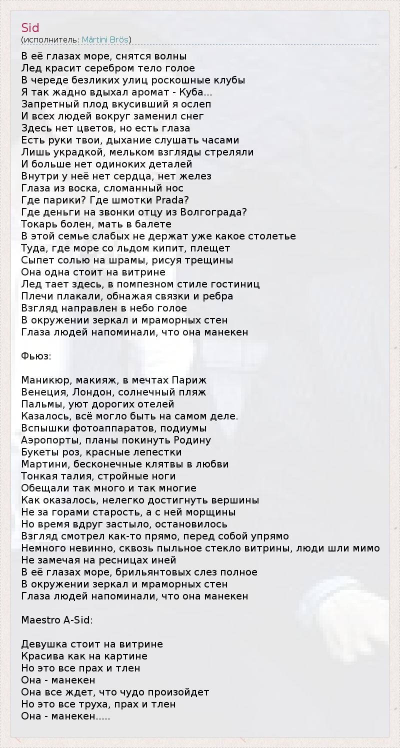 В её глазах море, снятся волны Лед красит серебром тело голое В череде безликих улиц роскошные клубы Я так жадно вдыхал аромат - Куба... Запретный плод вкусивший я ослеп И всех людей вокруг заменил снег Здесь нет цветов, но есть глаза Есть руки твои, дыхание слушать часами Лишь украдкой, мельком взгляды стреляли И больше нет одиноких деталей Внутри у неё нет сердца, нет желез Глаза из воска, сломанный нос Где парики? Где шмотки Prada? Где деньги на звонки отцу из Волгограда? Токарь болен, мать в балете В этой семье слабых не держат уже какое столетье Туда, где море со льдом кипит, плещет Сыпет солью на шрамы, рисуя трещины Она одна стоит на витрине Лед тает здесь, в помпезном стиле гостиниц Плечи плакали, обнажая связки и ребра Взгляд направлен в небо голое В окружении зеркал и мраморных стен Глаза людей напоминали, что она манекен Фьюз: Маникюр, макияж, в мечтах Париж Венеция, Лондон, солнечный пляж Пальмы, уют дорогих отелей Казалось, всё могло быть на самом деле. Вспышки фотоаппаратов, подиумы Аэропорты, планы покинуть Родину Букеты роз, красные лепестки Мартини, бесконечные клятвы в любви Тонкая талия, стройные ноги Обещали так много и так многие Как оказалось, нелегко достигнуть вершины Не за горами старость, а с ней морщины Но время вдруг застыло, остановилось Взгляд смотрел как-то прямо, перед собой упрямо Немного невинно, сквозь пыльное стекло витрины, люди шли мимо Не замечая на ресницах иней В её глазах море, брильянтовых слез полное В окружении зеркал и мраморных стен Глаза людей напоминали, что она манекен Maestro A-Sid: Девушка стоит на витрине Красива как на картине Но это все прах и тлен Она - манекен Она все ждет, что чудо произойдет Но это все труха, прах и тлен Она - манекен.....