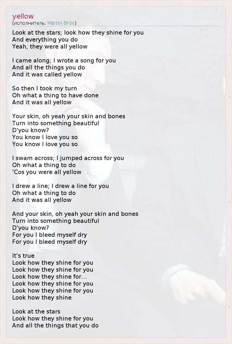 Посмотри на звезды, посмотри как они светят на тебя И на все твои дела, Да, они все были же.тые Тут пришел я, написал песню для тебя И для всех твоих дел И назвал ее «Yellow». Потом пришло время действовать. Как это тяжело! И тут я испугался... Твоя кожа, твоя кожа и тело Так красивы... Ты знала, Что я тебя так сильно люблю? Что я тебя так сильно люблю? Я переплыл море, прыгал через пропасть, Чего только я ни делал, Но ты меня не полюбила.... Я провел между нами черту,я провел для тебя черту, Как это было тяжело И страшно!... Твоя кожа, твоя кожа и тело Так красивы! Ты знала? Знала, что из-за тебя я мучаюсь? Знала, что из-за тебя я мучаюсь? Это правда… Посмотри, как они на тебя светят… Посмотри, как они на тебя светят… Посмотри, как они на тебя светят… Посмотри, как они на тебя светят… Посмотри, как они на тебя светят… Посмотри, как они светят… Посмотри на звезды, Посмотри как они светят на тебя И на все твои дела...