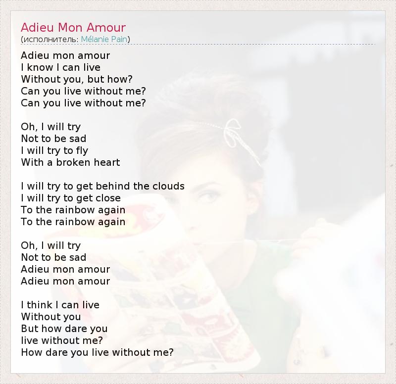 Adieu mon amour I know I can live Without you, but how? Can you live without me? Can you live without me? Oh, I will try Not to be sad I will try to fly With a broken heart I will try to get behind the clouds I will try to get close To the rainbow again To the rainbow again Oh, I will try Not to be sad Adieu mon amour Adieu mon amour I think I can live Without you But how dare you live without me? How dare you live without me?