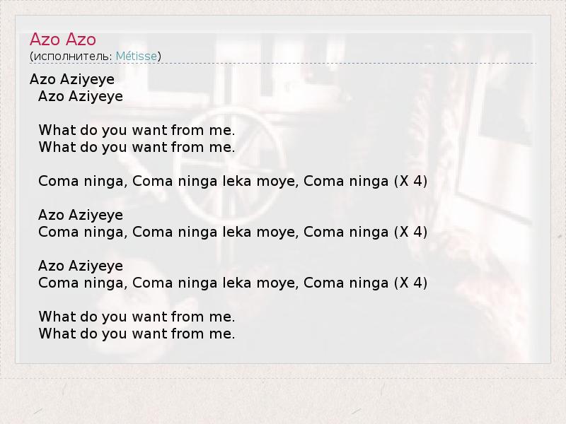 Azo Aziyeye Azo Aziyeye What do you want from me. What do you want from me. Coma ninga, Coma ninga leka moye, Coma ninga (X 4) Azo Aziyeye Coma ninga, Coma ninga leka moye, Coma ninga (X 4) Azo Aziyeye Coma ninga, Coma ninga leka moye, Coma ninga (X 4) What do you want from me. What do you want from me.