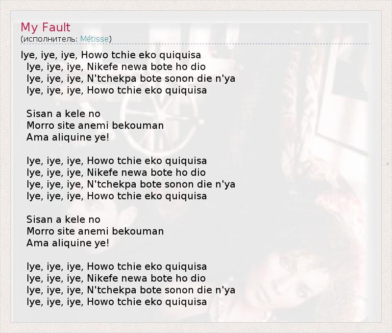 Iye, iye, iye, Howo tchie eko quiquisa Iye, iye, iye, Nikefe newa bote ho dio Iye, iye, iye, N'tchekpa bote sonon die n'ya Iye, iye, iye, Howo tchie eko quiquisa Sisan a kele no Morro site anemi bekouman Ama aliquine ye! Iye, iye, iye, Howo tchie eko quiquisa Iye, iye, iye, Nikefe newa bote ho dio Iye, iye, iye, N'tchekpa bote sonon die n'ya Iye, iye, iye, Howo tchie eko quiquisa Sisan a kele no Morro site anemi bekouman Ama aliquine ye! Iye, iye, iye, Howo tchie eko quiquisa Iye, iye, iye, Nikefe newa bote ho dio Iye, iye, iye, N'tchekpa bote sonon die n'ya Iye, iye, iye, Howo tchie eko quiquisa