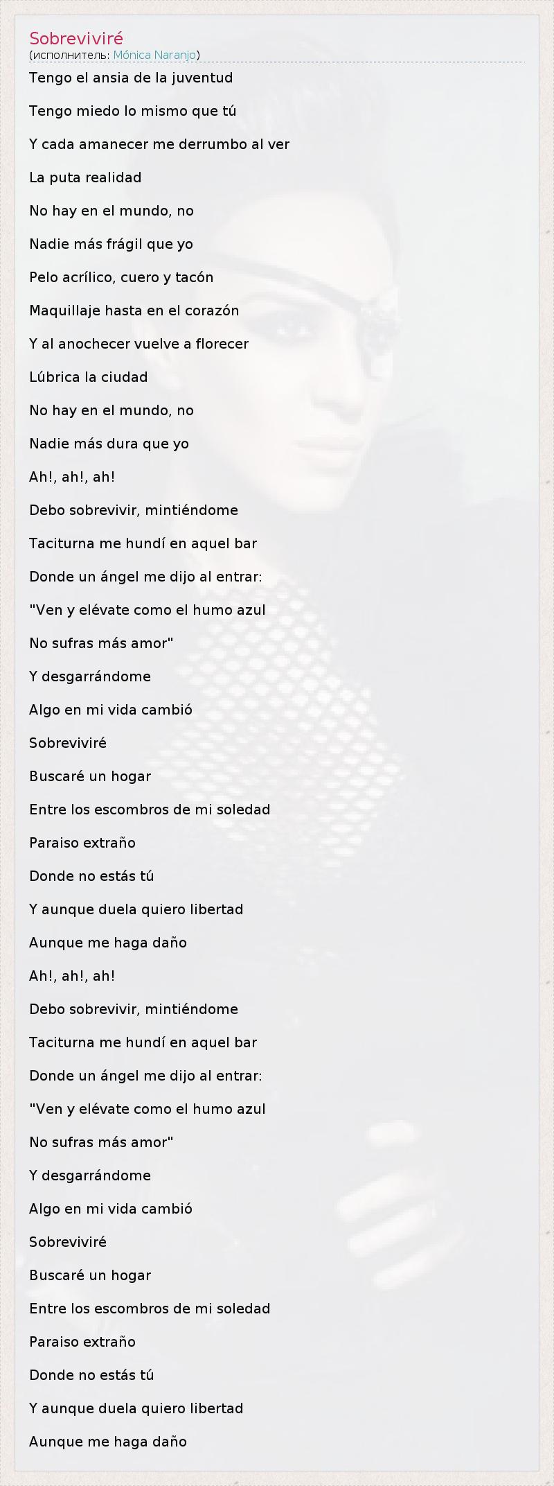 Tengo el ansia de la juventud Tengo miedo lo mismo que tú Y cada amanecer me derrumbo al ver La puta realidad No hay en el mundo, no Nadie más frágil que yo Pelo acrílico, cuero y tacón Maquillaje hasta en el corazón Y al anochecer vuelve a florecer Lúbrica la ciudad No hay en el mundo, no Nadie más dura que yo Ah!, ah!, ah! Debo sobrevivir, mintiéndome Taciturna me hundí en aquel bar Donde un ángel me dijo al entrar: "Ven y elévate como el humo azul No sufras más amor" Y desgarrándome Algo en mi vida cambió Sobreviviré Buscaré un hogar Entre los escombros de mi soledad Paraiso extraño Donde no estás tú Y aunque duela quiero libertad Aunque me haga daño Ah!, ah!, ah! Debo sobrevivir, mintiéndome Taciturna me hundí en aquel bar Donde un ángel me dijo al entrar: "Ven y elévate como el humo azul No sufras más amor" Y desgarrándome Algo en mi vida cambió Sobreviviré Buscaré un hogar Entre los escombros de mi soledad Paraiso extraño Donde no estás tú Y aunque duela quiero libertad Aunque me haga daño