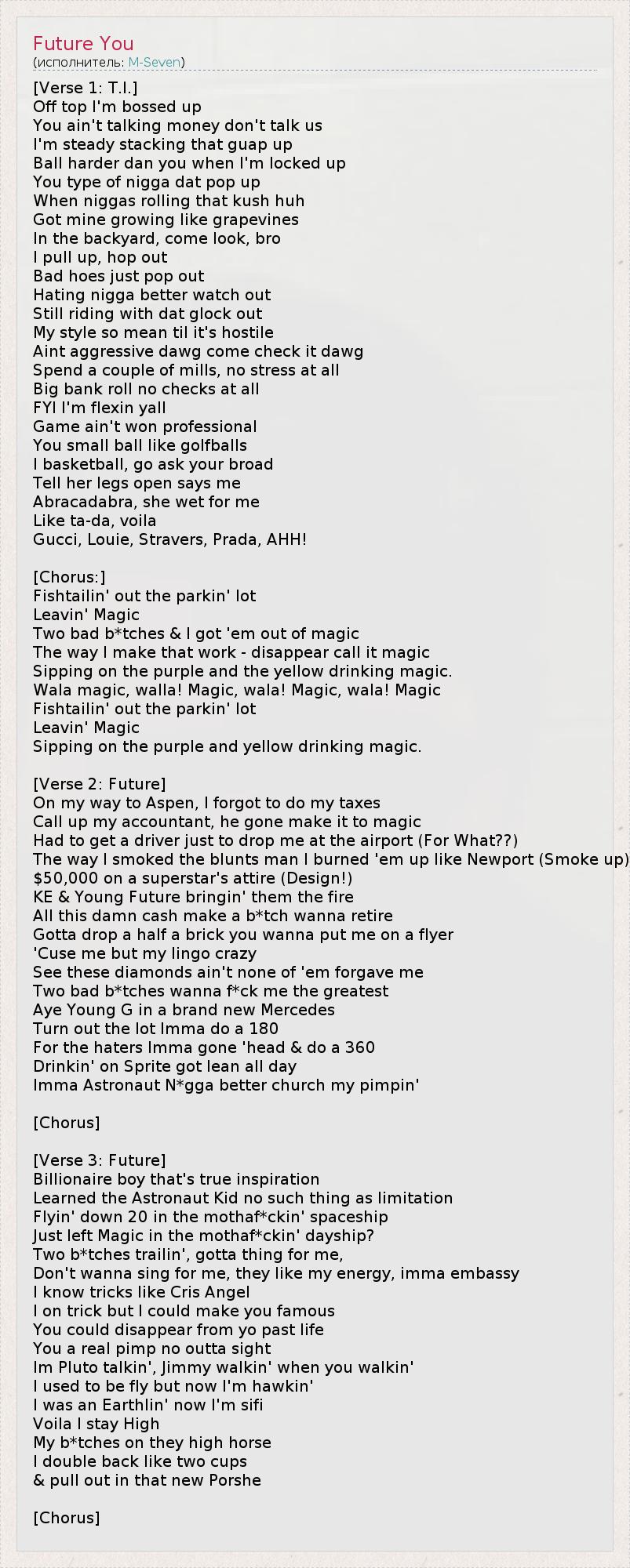 5 – Purple drank - это сленговый термин наркотика популярного в хип хоп обществе в южных Штатах. Его часто смешивают с соком. Также Purple и Yellow (Gold) - цвета баскетбольного клуба "Lakers".