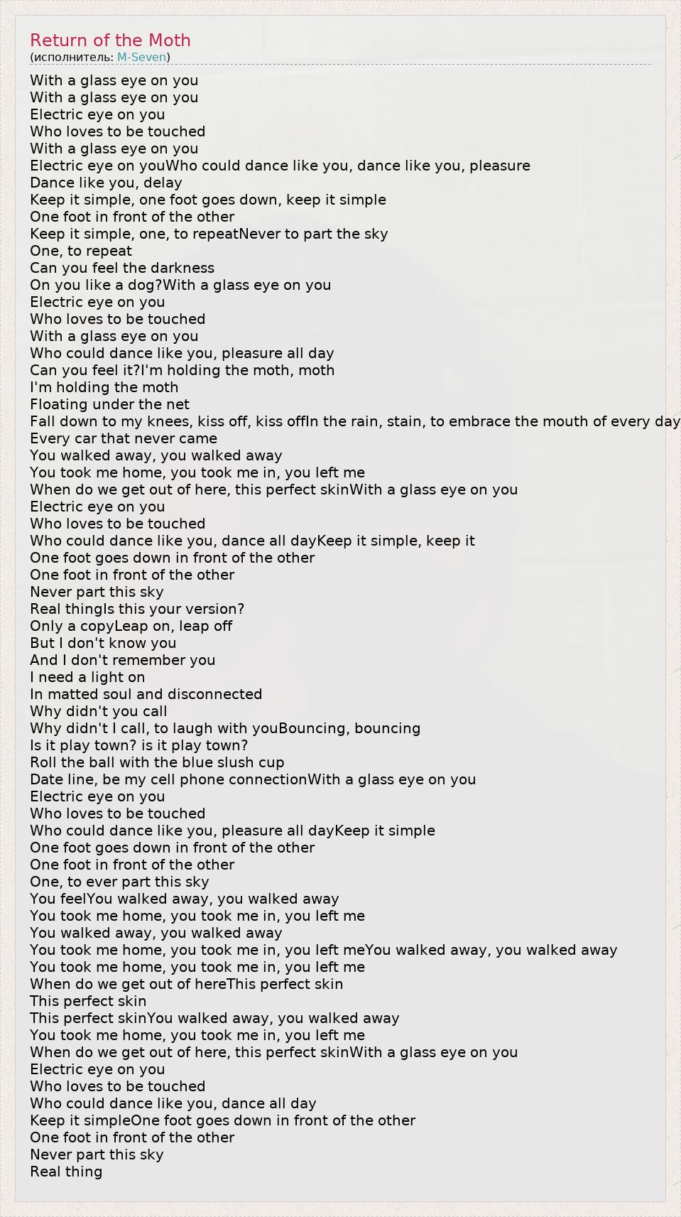 With a glass eye on you With a glass eye on you Electric eye on you Who loves to be touched With a glass eye on you Electric eye on youWho could dance like you, dance like you, pleasure Dance like you, delay Keep it simple, one foot goes down, keep it simple One foot in front of the other Keep it simple, one, to repeatNever to part the sky One, to repeat Can you feel the darkness On you like a dog?With a glass eye on you Electric eye on you Who loves to be touched With a glass eye on you Who could dance like you, pleasure all day Can you feel it?I'm holding the moth, moth I'm holding the moth Floating under the net Fall down to my knees, kiss off, kiss offIn the rain, stain, to embrace the mouth of every day Every car that never came You walked away, you walked away You took me home, you took me in, you left me When do we get out of here, this perfect skinWith a glass eye on you Electric eye on you Who loves to be touched Who could dance like you, dance all dayKeep it simple, keep it One foot goes down in front of the other One foot in front of the other Never part this sky Real thingIs this your version? Only a copyLeap on, leap off But I don't know you And I don't remember you I need a light on In matted soul and disconnected Why didn't you call Why didn't I call, to laugh with youBouncing, bouncing Is it play town? is it play town? Roll the ball with the blue slush cup Date line, be my cell phone connectionWith a glass eye on you Electric eye on you Who loves to be touched Who could dance like you, pleasure all dayKeep it simple One foot goes down in front of the other One foot in front of the other One, to ever part this sky You feelYou walked away, you walked away You took me home, you took me in, you left me You walked away, you walked away You took me home, you took me in, you left meYou walked away, you walked away You took me home, you took me in, you left me When do we get out of hereThis perfect skin This perfect skin This perfect skinYou walked away, you walked away You took me home, you took me in, you left me When do we get out of here, this perfect skinWith a glass eye on you Electric eye on you Who loves to be touched Who could dance like you, dance all day Keep it simpleOne foot goes down in front of the other One foot in front of the other Never part this sky Real thing