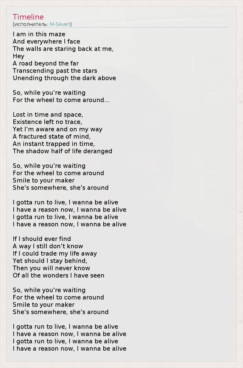 I am in this maze And everywhere I face The walls are staring back at me, Hey A road beyond the far Transcending past the stars Unending through the dark above So, while you're waiting For the wheel to come around... Lost in time and space, Existence left no trace, Yet I'm aware and on my way A fractured state of mind, An instant trapped in time, The shadow half of life deranged So, while you're waiting For the wheel to come around Smile to your maker She's somewhere, she's around I gotta run to live, I wanna be alive I have a reason now, I wanna be alive I gotta run to live, I wanna be alive I have a reason now, I wanna be alive If I should ever find A way I still don't know If I could trade my life away Yet should I stay behind, Then you will never know Of all the wonders I have seen So, while you're waiting For the wheel to come around Smile to your maker She's somewhere, she's around I gotta run to live, I wanna be alive I have a reason now, I wanna be alive I gotta run to live, I wanna be alive I have a reason now, I wanna be alive