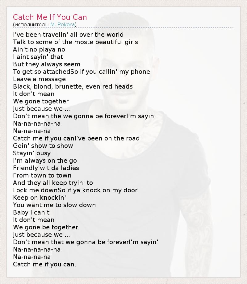 I've been travelin' all over the world Talk to some of the moste beautiful girls Ain't no playa no I aint sayin' that But they always seem To get so attachedSo if you callin' my phone Leave a message Black, blond, brunette, even red heads It don't mean We gone together Just because we .... Don't mean the we gonna be foreverI'm sayin' Na-na-na-na-na Na-na-na-na Catch me if you canI've been on the road Goin' show to show Stayin' busy I'm always on the go Friendly wit da ladies From town to town And they all keep tryin' to Lock me downSo if ya knock on my door Keep on knockin' You want me to slow down Baby I can't It don't mean We gone be together Just because we .... Don't mean that we gonna be foreverI'm sayin' Na-na-na-na-na Na-na-na-na Catch me if you can.
