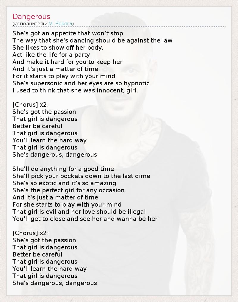 У неё ненасытный аппетит. То, как она танцует, - противозаконно! Ей нравится выставлять напоказ своё тело И быть душой вечеринки. Тебе будет очень сложно удержать её. Она почти завладела твоими мыслями - Это лишь вопрос времени… Она несравненна… Её взгляд гипнотизирует… А я раньше думал, что она безобидная… [Припев: 2 раза] В ней есть страсть… Эта девушка опасна, Будь осторожен! Эта девушка опасна, Ты узнаешь на горьком опыте, Что эта девушка опасна! Она опасна, опасна! Она готова на всё, лишь бы хорошо провести время, Она обчистит тебя до последнего цента, Она – нечто экзотическое и потрясающее, Она – идеальная девушка на любой случай! Она почти завладела твоими мыслями - Это лишь вопрос времени… Эта девушка – зло, и её любовь должна быть запрещена. Близко подойдя и посмотрев на неё, ты захочешь быть с ней… [Припев: 2 раза] В ней есть страсть… Эта девушка опасна, Будь осторожен! Эта девушка опасна, Ты узнаешь на горьком опыте, Что эта девушка опасна! Она опасна, опасна!