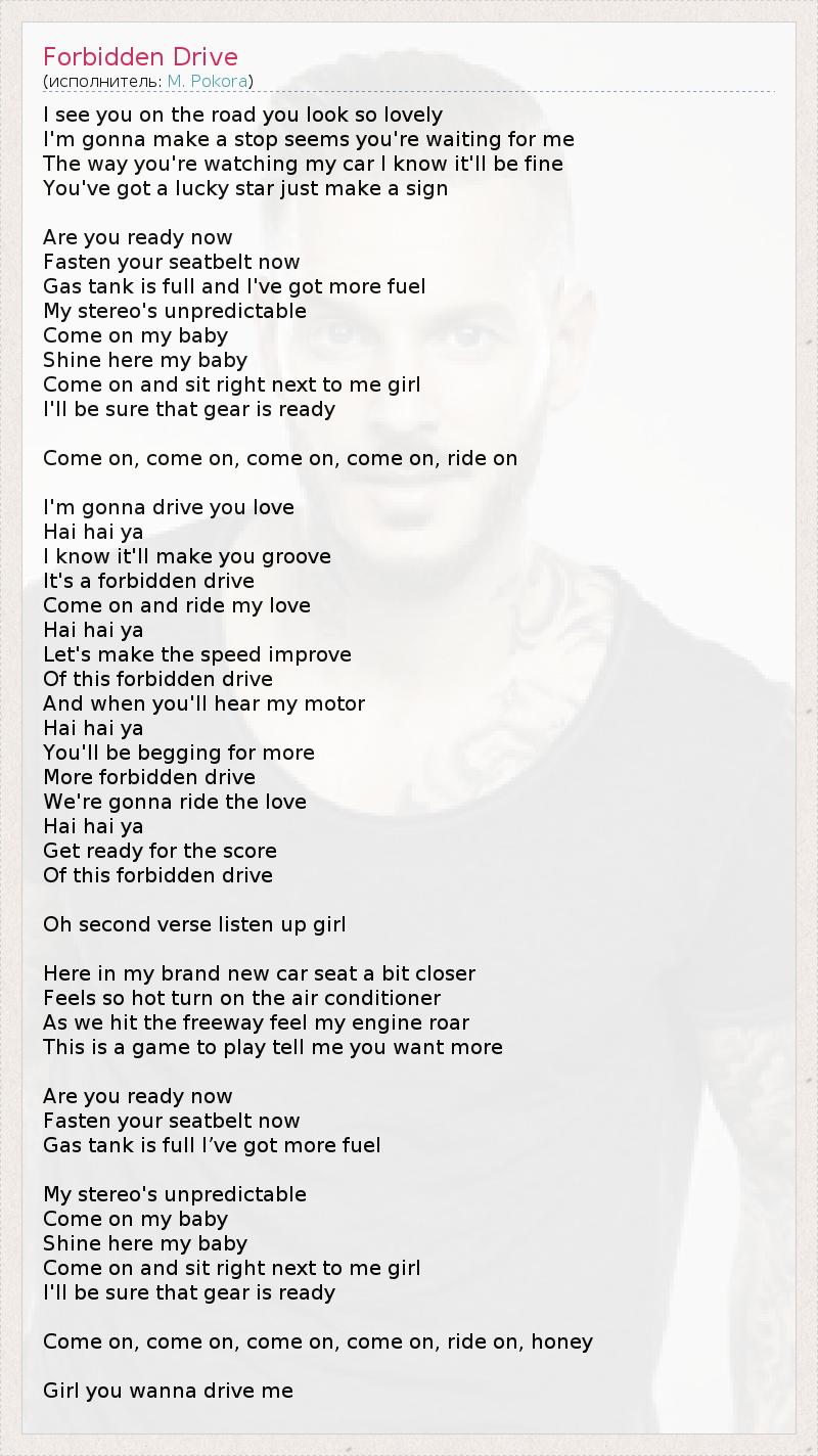 Я вижу тебя на дороге, ты так прекрасно выглядишь, Наверное, я остановлюсь, кажется, ты ждёшь меня. По твоему взгляду на твою машину я вижу, что всё пройдет отлично, У тебя счастливая звезда, просто подай знак. Теперь ты готова? Пристегни ремень, Бензобак полон, а во мне ещё больше топлива. Моя музыка непредсказуема, Давай, моя малышка, Сверкай здесь, моя малышка, Давай, садись возле меня, малышка, Я буду уверен, что мотор заведётся. Давай, давай, давай, давай, держись! Я подвезу тебя домой, Хэй-хэй-йа! Я знаю, тебе это доставит удовольствие, Давай, поехали, моя любовь, Хэй-хэй-йа! Давай ускорим Эту запретную поездку, И когда ты услышишь мой мотор, Хэй-хэй-йа! Ты будешь просить большего, Ещё запретной поездки, Мы прокатимся на любви! Хэй-хэй-йа! Приготовься к началу Этой запретной поездки! О, второй куплет, слушай, девчонка! В этой новой тачке сиденья чуть ближе, Так жарко, включи кондиционер… Пока мы несёмся по автостраде, почувствуй рёв моего мотора, Мы сыграем в эту игру, скажи, что хочешь большего! Ты готова? Пристегни ремень, Бензобак полон, а во мне ещё больше топлива. Моя музыка непредсказуема, Давай, моя малышка, Сверкай здесь, моя малышка, Давай, садись возле меня, малышка, Я буду уверен, что мотор заведётся. Давай, давай, давай, давай, держись! Девчонка, ты хочешь прокатить меня?!