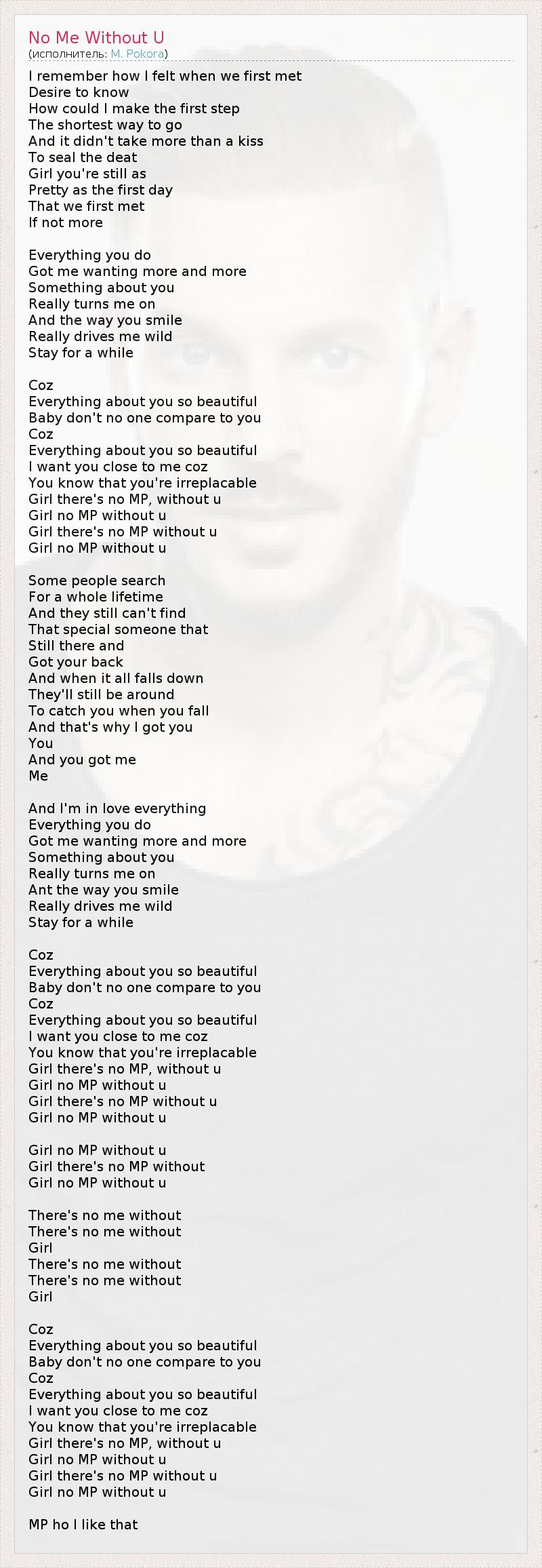 I remember how I felt when we first met Desire to know How could I make the first step The shortest way to go And it didn't take more than a kiss To seal the deat Girl you're still as Pretty as the first day That we first met If not more Everything you do Got me wanting more and more Something about you Really turns me on And the way you smile Really drives me wild Stay for a while Coz Everything about you so beautiful Baby don't no one compare to you Coz Everything about you so beautiful I want you close to me coz You know that you're irreplacable Girl there's no MP, without u Girl no MP without u Girl there's no MP without u Girl no MP without u Some people search For a whole lifetime And they still can't find That special someone that Still there and Got your back And when it all falls down They'll still be around To catch you when you fall And that's why I got you You And you got me Me And I'm in love everything Everything you do Got me wanting more and more Something about you Really turns me on Ant the way you smile Really drives me wild Stay for a while Coz Everything about you so beautiful Baby don't no one compare to you Coz Everything about you so beautiful I want you close to me coz You know that you're irreplacable Girl there's no MP, without u Girl no MP without u Girl there's no MP without u Girl no MP without u Girl no MP without u Girl there's no MP without Girl no MP without u There's no me without There's no me without Girl There's no me without There's no me without Girl Coz Everything about you so beautiful Baby don't no one compare to you Coz Everything about you so beautiful I want you close to me coz You know that you're irreplacable Girl there's no MP, without u Girl no MP without u Girl there's no MP without u Girl no MP without u MP ho I like that