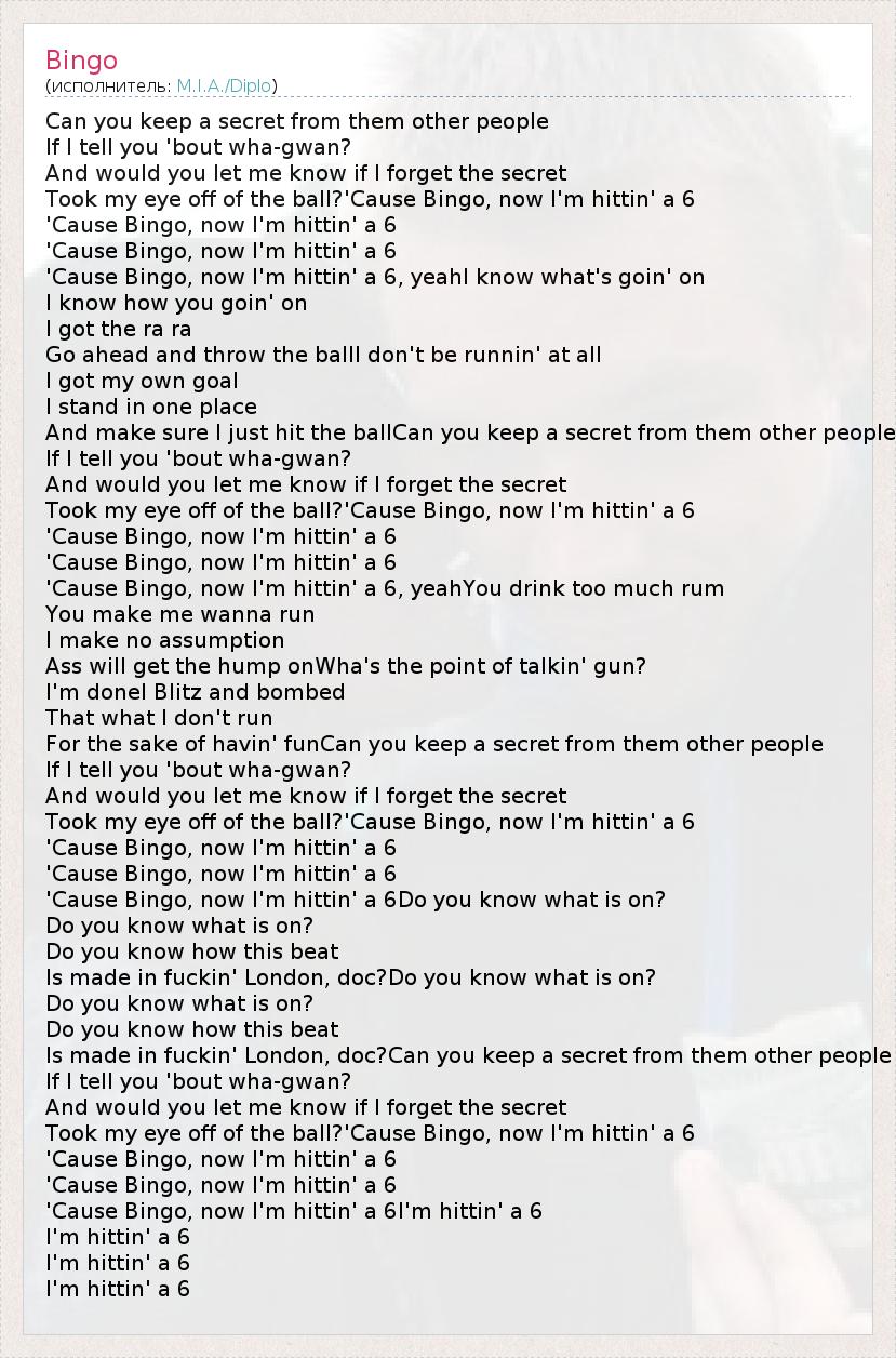 Can you keep a secret from them other people If I tell you 'bout wha-gwan? And would you let me know if I forget the secret Took my eye off of the ball?'Cause Bingo, now I'm hittin' a 6 'Cause Bingo, now I'm hittin' a 6 'Cause Bingo, now I'm hittin' a 6 'Cause Bingo, now I'm hittin' a 6, yeahI know what's goin' on I know how you goin' on I got the ra ra Go ahead and throw the ballI don't be runnin' at all I got my own goal I stand in one place And make sure I just hit the ballCan you keep a secret from them other people If I tell you 'bout wha-gwan? And would you let me know if I forget the secret Took my eye off of the ball?'Cause Bingo, now I'm hittin' a 6 'Cause Bingo, now I'm hittin' a 6 'Cause Bingo, now I'm hittin' a 6 'Cause Bingo, now I'm hittin' a 6, yeahYou drink too much rum You make me wanna run I make no assumption Ass will get the hump onWha's the point of talkin' gun? I'm donel Blitz and bombed That what I don't run For the sake of havin' funCan you keep a secret from them other people If I tell you 'bout wha-gwan? And would you let me know if I forget the secret Took my eye off of the ball?'Cause Bingo, now I'm hittin' a 6 'Cause Bingo, now I'm hittin' a 6 'Cause Bingo, now I'm hittin' a 6 'Cause Bingo, now I'm hittin' a 6Do you know what is on? Do you know what is on? Do you know how this beat Is made in fuckin' London, doc?Do you know what is on? Do you know what is on? Do you know how this beat Is made in fuckin' London, doc?Can you keep a secret from them other people If I tell you 'bout wha-gwan? And would you let me know if I forget the secret Took my eye off of the ball?'Cause Bingo, now I'm hittin' a 6 'Cause Bingo, now I'm hittin' a 6 'Cause Bingo, now I'm hittin' a 6 'Cause Bingo, now I'm hittin' a 6I'm hittin' a 6 I'm hittin' a 6 I'm hittin' a 6 I'm hittin' a 6
