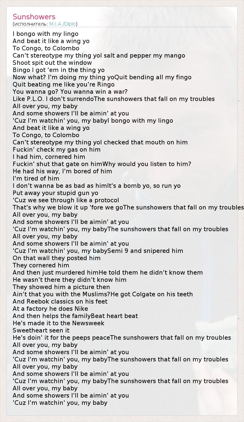 I bongo with my lingo And beat it like a wing yo To Congo, to Colombo Can't stereotype my thing yoI salt and pepper my mango Shoot spit out the window Bingo I got 'em in the thing yo Now what? I'm doing my thing yoQuit bending all my fingo Quit beating me like you're Ringo You wanna go? You wanna win a war? Like P.L.O. I don't surrendoThe sunshowers that fall on my troubles All over you, my baby And some showers I'll be aimin' at you 'Cuz I'm watchin' you, my babyI bongo with my lingo And beat it like a wing yo To Congo, to Colombo Can't stereotype my thing yoI checked that mouth on him Fuckin' check my gas on him I had him, cornered him Fuckin' shut that gate on himWhy would you listen to him? He had his way, I'm bored of him I'm tired of him I don't wanna be as bad as himIt's a bomb yo, so run yo Put away your stupid gun yo 'Cuz we see through like a protocol That's why we blow it up 'fore we goThe sunshowers that fall on my troubles All over you, my baby And some showers I'll be aimin' at you 'Cuz I'm watchin' you, my babyThe sunshowers that fall on my troubles All over you, my baby And some showers I'll be aimin' at you 'Cuz I'm watchin' you, my babySemi 9 and snipered him On that wall they posted him They cornered him And then just murdered himHe told them he didn't know them He wasn't there they didn't know him They showed him a picture then Ain't that you with the Muslims?He got Colgate on his teeth And Reebok classics on his feet At a factory he does Nike And then helps the familyBeat heart beat He's made it to the Newsweek Sweetheart seen it He's doin' it for the peeps peaceThe sunshowers that fall on my troubles All over you, my baby And some showers I'll be aimin' at you 'Cuz I'm watchin' you, my babyThe sunshowers that fall on my troubles All over you, my baby And some showers I'll be aimin' at you 'Cuz I'm watchin' you, my babyThe sunshowers that fall on my troubles All over you, my baby And some showers I'll be aimin' at you 'Cuz I'm watchin' you, my baby