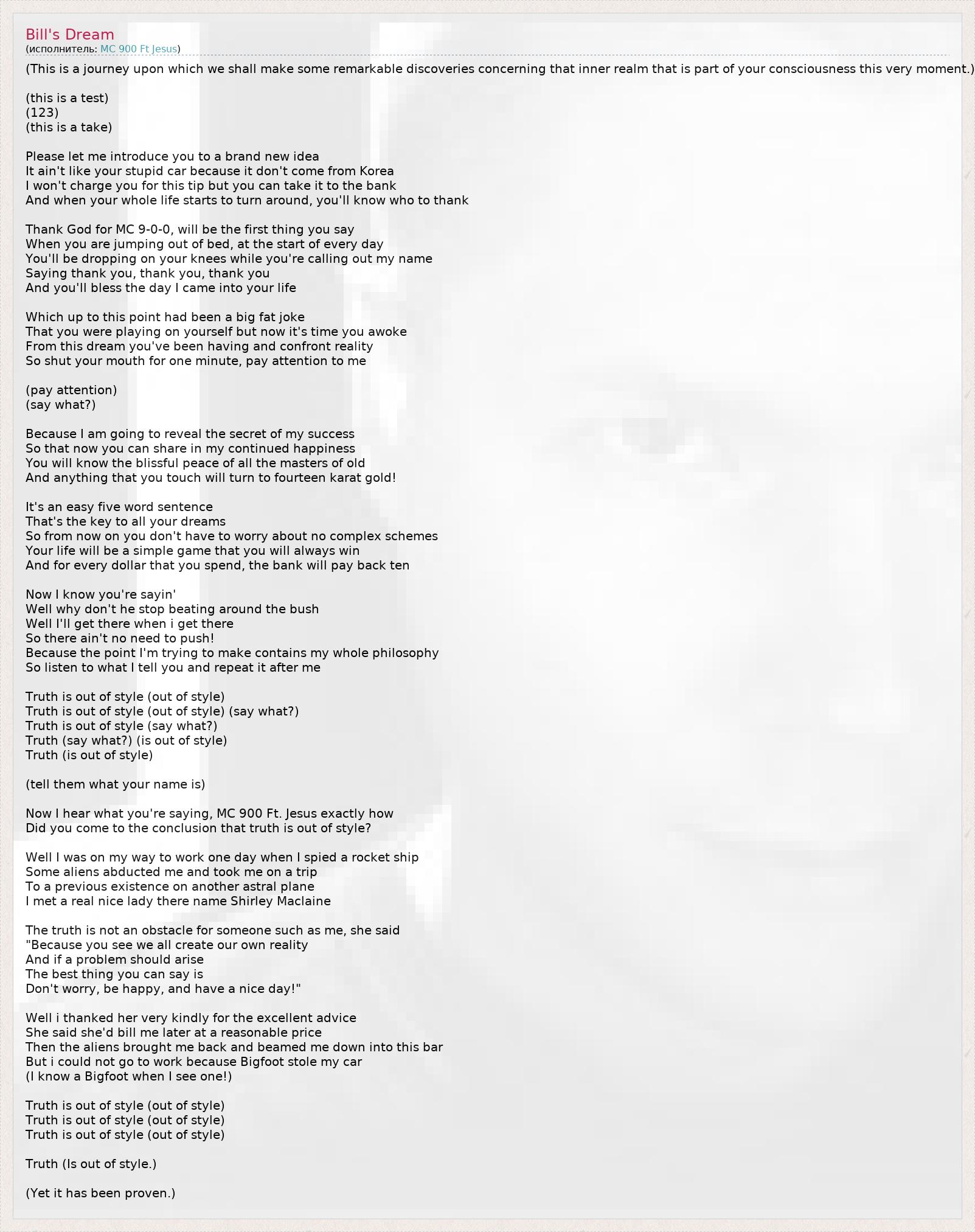 Это интересно:MC 900 ft Jesus (Марк Гриффин) - музыкант-экспериментатор из Далласа, в начале 90-х выпустивший три пропитанных смесью христианства, абстракции и джаза альбома. Имя было заимствовано им из речи одного телевизионного проповедника, которому пришло видение, в котором девятисотфутовый Иисус стоял на месте, где надо построить больницу.