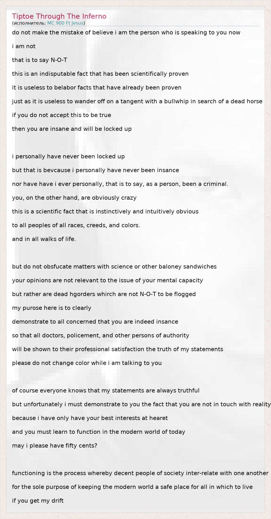 ГлавнаяИсполнителиMC 900 Ft JesusTiptoe Through The Inferno