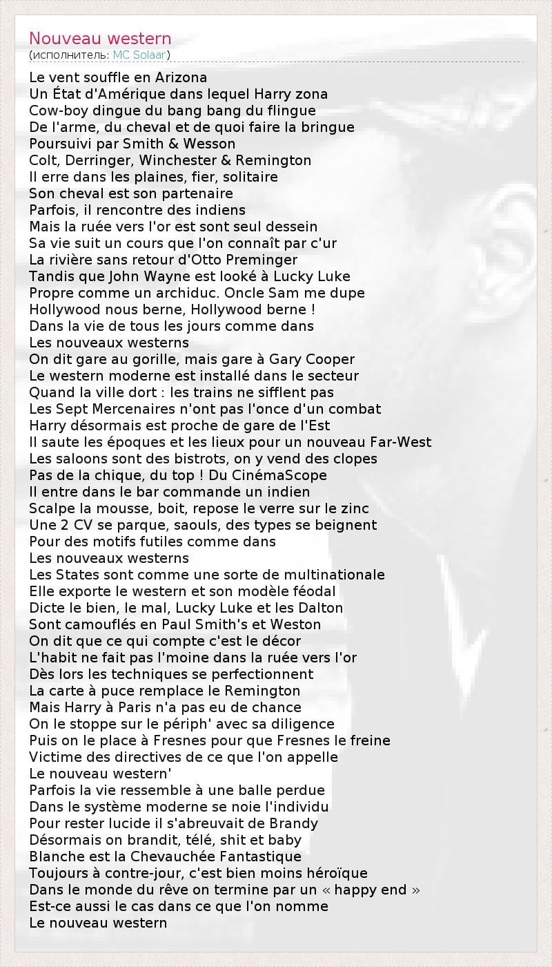 Le vent souffle en Arizona Un État d'Amérique dans lequel Harry zona Cow-boy dingue du bang bang du flingue De l'arme, du cheval et de quoi faire la bringue Poursuivi par Smith & Wesson Colt, Derringer, Winchester & Remington Il erre dans les plaines, fier, solitaire Son cheval est son partenaire Parfois, il rencontre des indiens Mais la ruée vers l'or est sont seul dessein Sa vie suit un cours que l'on connaît par c'ur La rivière sans retour d'Otto Preminger Tandis que John Wayne est looké à Lucky Luke Propre comme un archiduc. Oncle Sam me dupe Hollywood nous berne, Hollywood berne ! Dans la vie de tous les jours comme dans Les nouveaux westerns On dit gare au gorille, mais gare à Gary Cooper Le western moderne est installé dans le secteur Quand la ville dort : les trains ne sifflent pas Les Sept Mercenaires n'ont pas l'once d'un combat Harry désormais est proche de gare de l'Est Il saute les époques et les lieux pour un nouveau Far-West Les saloons sont des bistrots, on y vend des clopes Pas de la chique, du top ! Du CinémaScope Il entre dans le bar commande un indien Scalpe la mousse, boit, repose le verre sur le zinc Une 2 CV se parque, saouls, des types se beignent Pour des motifs futiles comme dans Les nouveaux westerns Les States sont comme une sorte de multinationale Elle exporte le western et son modèle féodal Dicte le bien, le mal, Lucky Luke et les Dalton Sont camouflés en Paul Smith's et Weston On dit que ce qui compte c'est le décor L'habit ne fait pas l'moine dans la ruée vers l'or Dès lors les techniques se perfectionnent La carte à puce remplace le Remington Mais Harry à Paris n'a pas eu de chance On le stoppe sur le périph' avec sa diligence Puis on le place à Fresnes pour que Fresnes le freine Victime des directives de ce que l'on appelle Le nouveau western' Parfois la vie ressemble à une balle perdue Dans le système moderne se noie l'individu Pour rester lucide il s'abreuvait de Brandy Désormais on brandit, télé, shit et baby Blanche est la Chevauchée Fantastique Toujours à contre-jour, c'est bien moins héroïque Dans le monde du rêve on termine par un « happy end » Est-ce aussi le cas dans ce que l'on nomme Le nouveau western