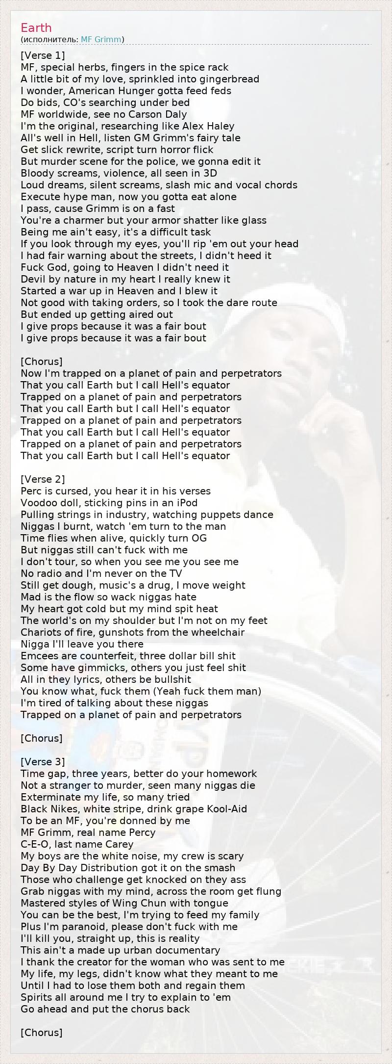 Это интересно:Percy Carey, также известный как MF Grimm, GM Grimm, The Grimm Reaper, Superstar Jet Jaguar и Build and Destroy — андерграунд рэп-исполнитель из Нью-Йорка, художник комиксов.В детстве Перси жил в Гарлеме, районе в северной части нью-йоркского округа Манхэттен. Его соседом был актёр Морган Фриман, который помог парню попасть на передачу Улица Сезам, в которой он был ребенком-актером. Будучи студентом средней школы, Кэрри... продолжение
