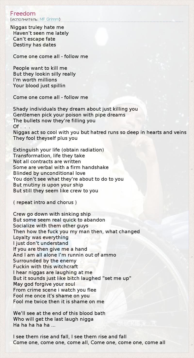Niggas truley hate me Haven't seen me lately Can't escape fate Destiny has dates Come one come all - follow me People want to kill me But they lookin silly really I'm worth millions Your blood just spillin Come one come all - follow me Shady individuals they dream about just killing you Gentlemen pick your poison with pipe dreams The bullets now they're filling you Of . . . Niggas act so cool with you but hatred runs so deep in hearts and veins They fool theyself plus you Extinguish your life (obtain radiation) Transformation, life they take Not all contracts are written Some are verbal with a firm handshake Blinded by unconditional love You don't see what they're about to do to you But mutiny is upon your ship But still they seem like crew to you ( repeat intro and chorus ) Crew go down with sinking ship But some seem real quick to abandon Socialize with them other guys Then how the fuck you my man then, what changed Loyalty was everything I just don't understand If you are then give me a hand And I am all alone I'm runnin out of ammo Surrounded by the enemy Fuckin with this witchcraft I hear niggas are laughing at me But it sounds just like bitch laughed "set me up" May god forgive your soul From crime scene i watch you flee Fool me once it's shame on you Fool me twice then it is shame on me We'll see at the end of this blood bath Who will get the last laugh nigga Ha ha ha ha ha ... I see them rise and fall, I see them rise and fall Come one, come one, come all, Come one, come one, come all