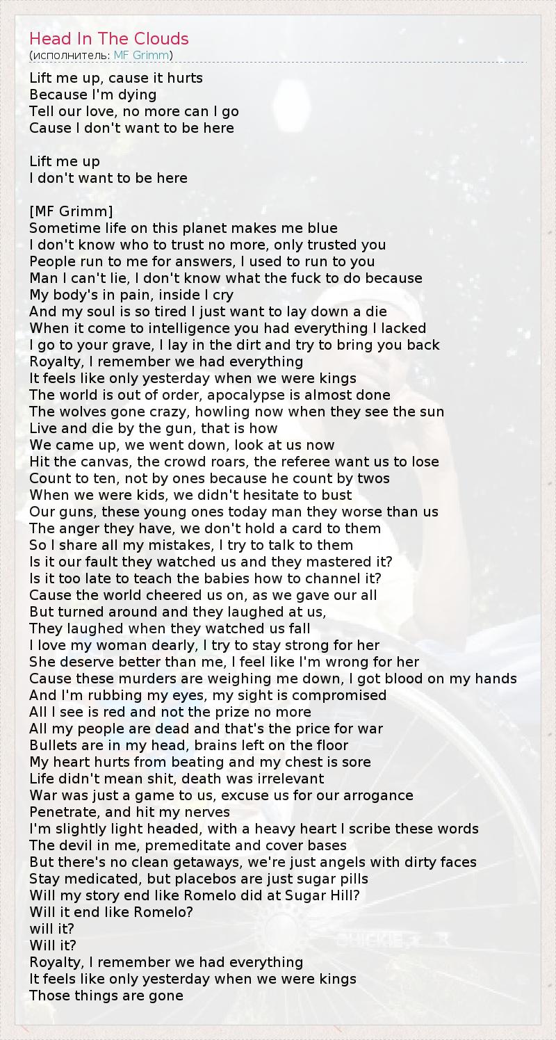 Lift me up, cause it hurts Because I'm dying Tell our love, no more can I go Cause I don't want to be here Lift me up I don't want to be here [MF Grimm] Sometime life on this planet makes me blue I don't know who to trust no more, only trusted you People run to me for answers, I used to run to you Man I can't lie, I don't know what the fuck to do because My body's in pain, inside I cry And my soul is so tired I just want to lay down a die When it come to intelligence you had everything I lacked I go to your grave, I lay in the dirt and try to bring you back Royalty, I remember we had everything It feels like only yesterday when we were kings The world is out of order, apocalypse is almost done The wolves gone crazy, howling now when they see the sun Live and die by the gun, that is how We came up, we went down, look at us now Hit the canvas, the crowd roars, the referee want us to lose Count to ten, not by ones because he count by twos When we were kids, we didn't hesitate to bust Our guns, these young ones today man they worse than us The anger they have, we don't hold a card to them So I share all my mistakes, I try to talk to them Is it our fault they watched us and they mastered it? Is it too late to teach the babies how to channel it? Cause the world cheered us on, as we gave our all But turned around and they laughed at us, They laughed when they watched us fall I love my woman dearly, I try to stay strong for her She deserve better than me, I feel like I'm wrong for her Cause these murders are weighing me down, I got blood on my hands And I'm rubbing my eyes, my sight is compromised All I see is red and not the prize no more All my people are dead and that's the price for war Bullets are in my head, brains left on the floor My heart hurts from beating and my chest is sore Life didn't mean shit, death was irrelevant War was just a game to us, excuse us for our arrogance Penetrate, and hit my nerves I'm slightly light headed, with a heavy heart I scribe these words The devil in me, premeditate and cover bases But there's no clean getaways, we're just angels with dirty faces Stay medicated, but placebos are just sugar pills Will my story end like Romelo did at Sugar Hill? Will it end like Romelo? will it? Will it? Royalty, I remember we had everything It feels like only yesterday when we were kings Those things are gone